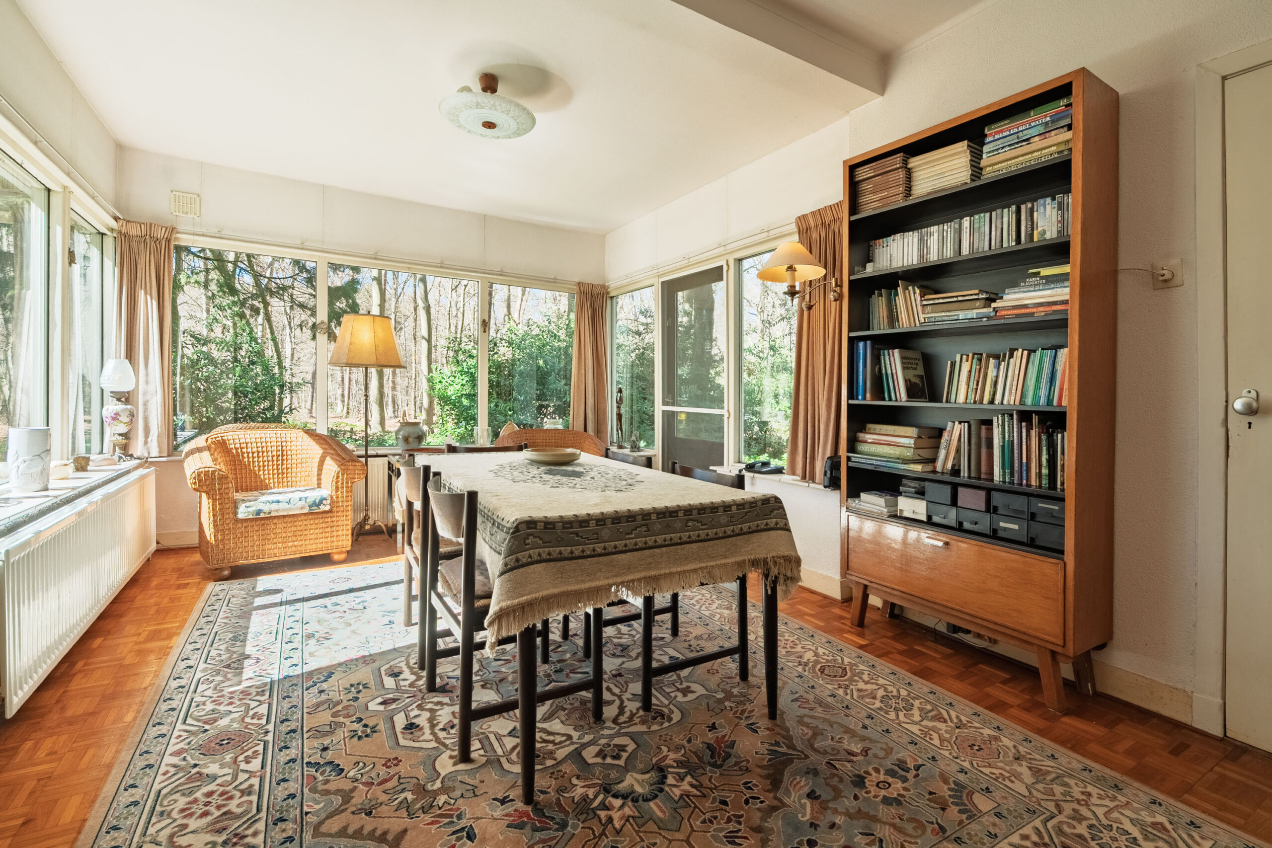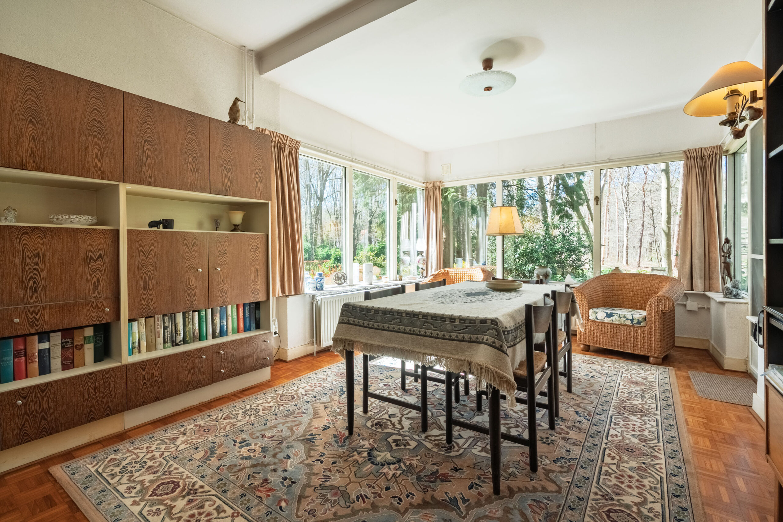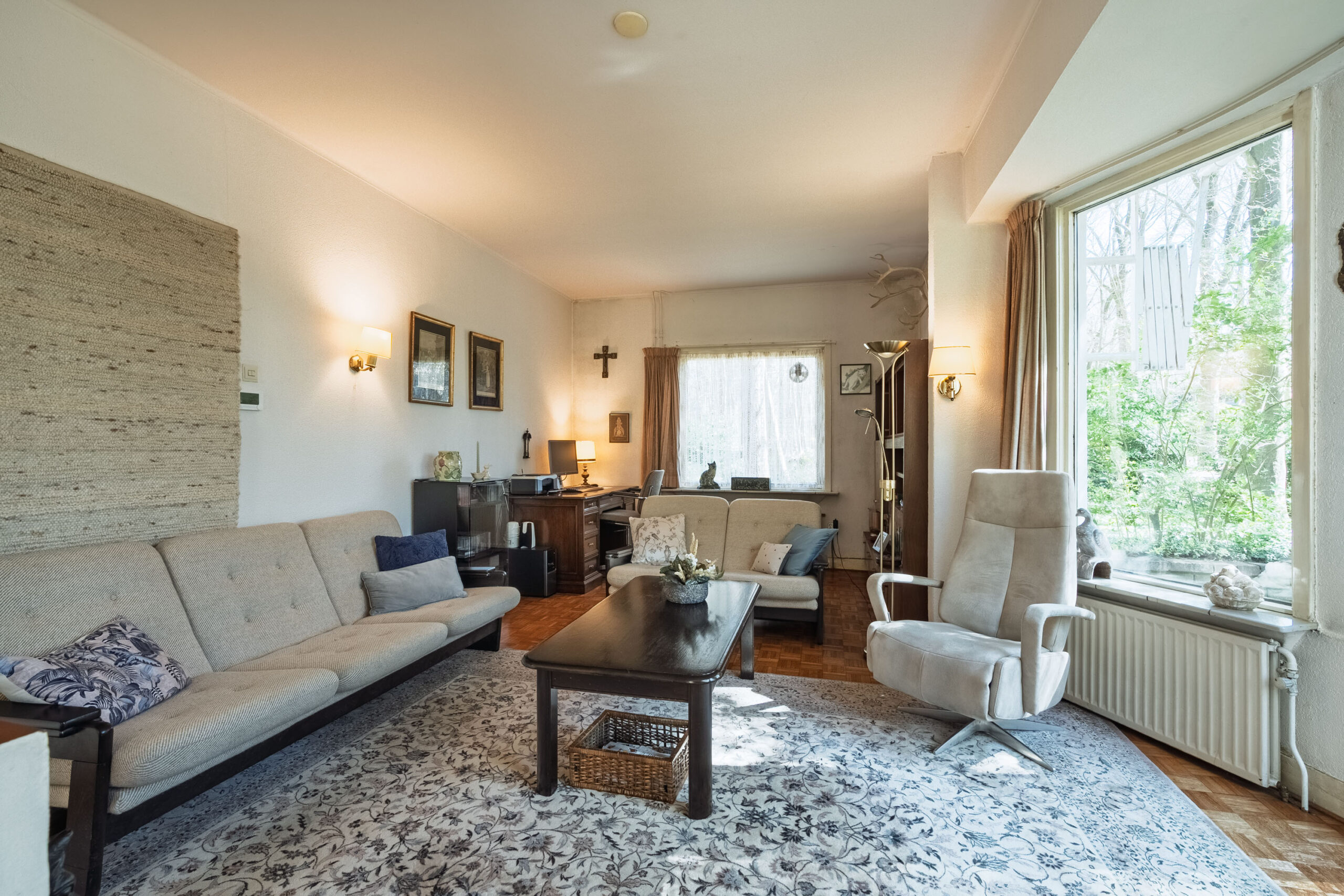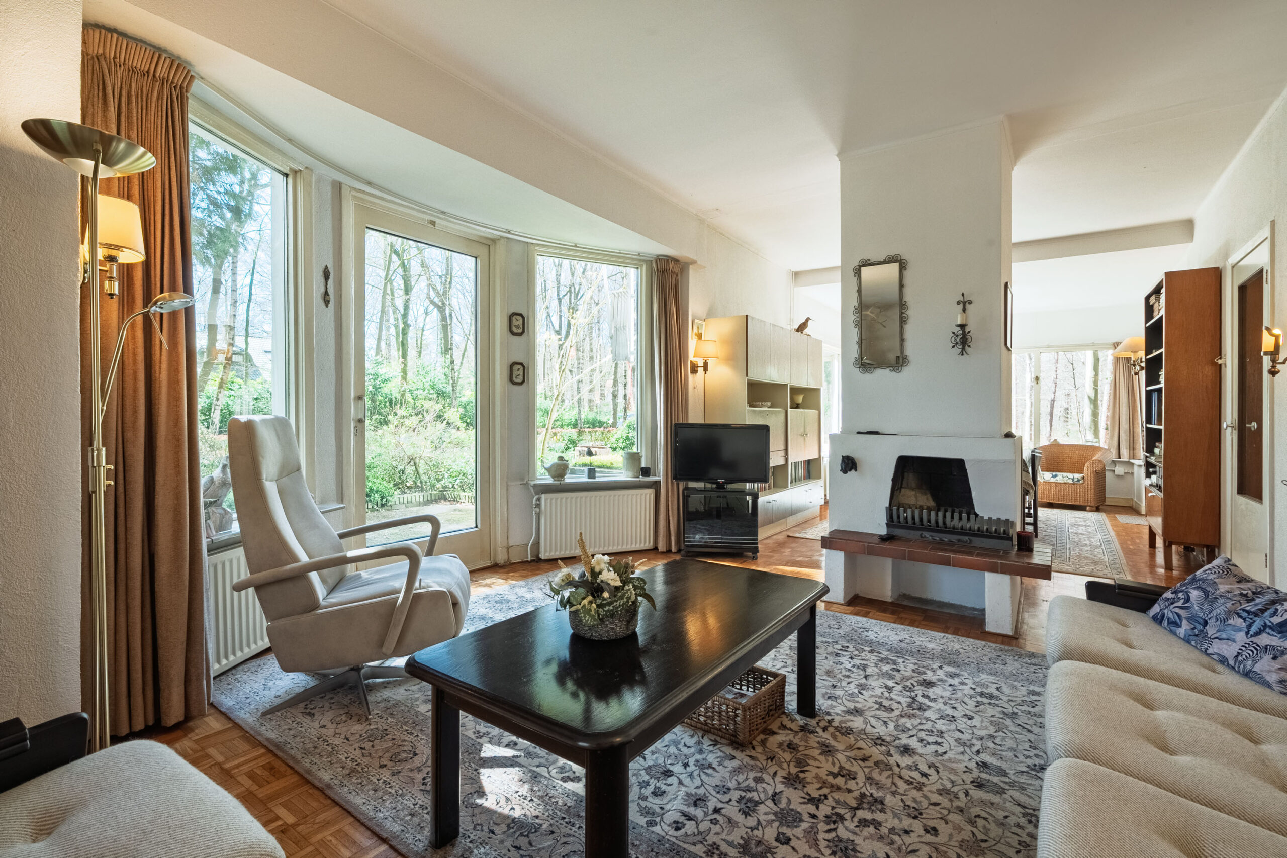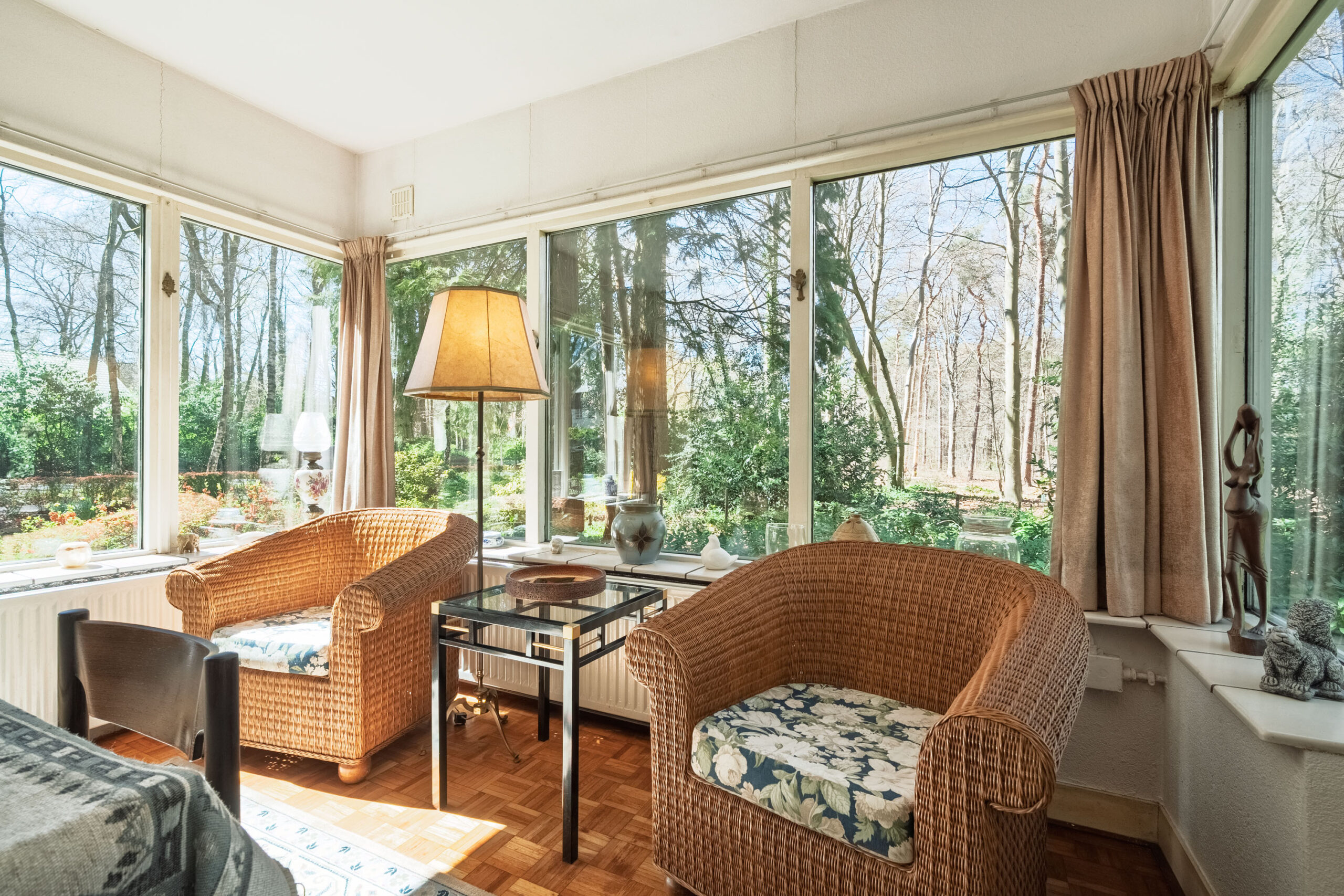 Aan de ene zijde van de woonkamer zorgen grote raampartijen voor een lichte, bijna serreachtige sfeer. Ze bieden niet alleen een fraai uitzicht op de omgeving, maar laten ook een overvloed aan daglicht binnen. De andere zijde is momenteel ingericht als zitkamer en beschikt over een erker met een deur naar buiten.