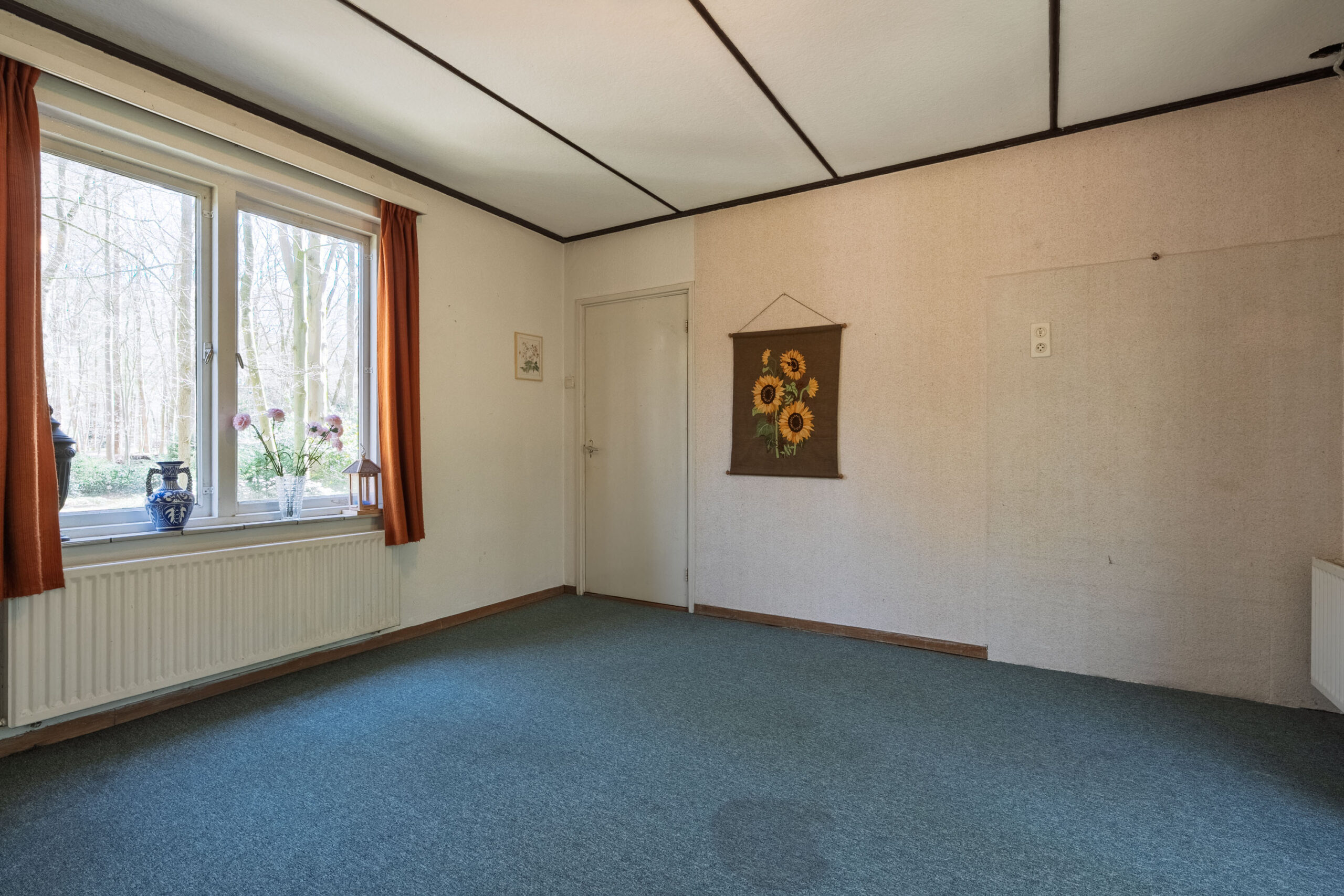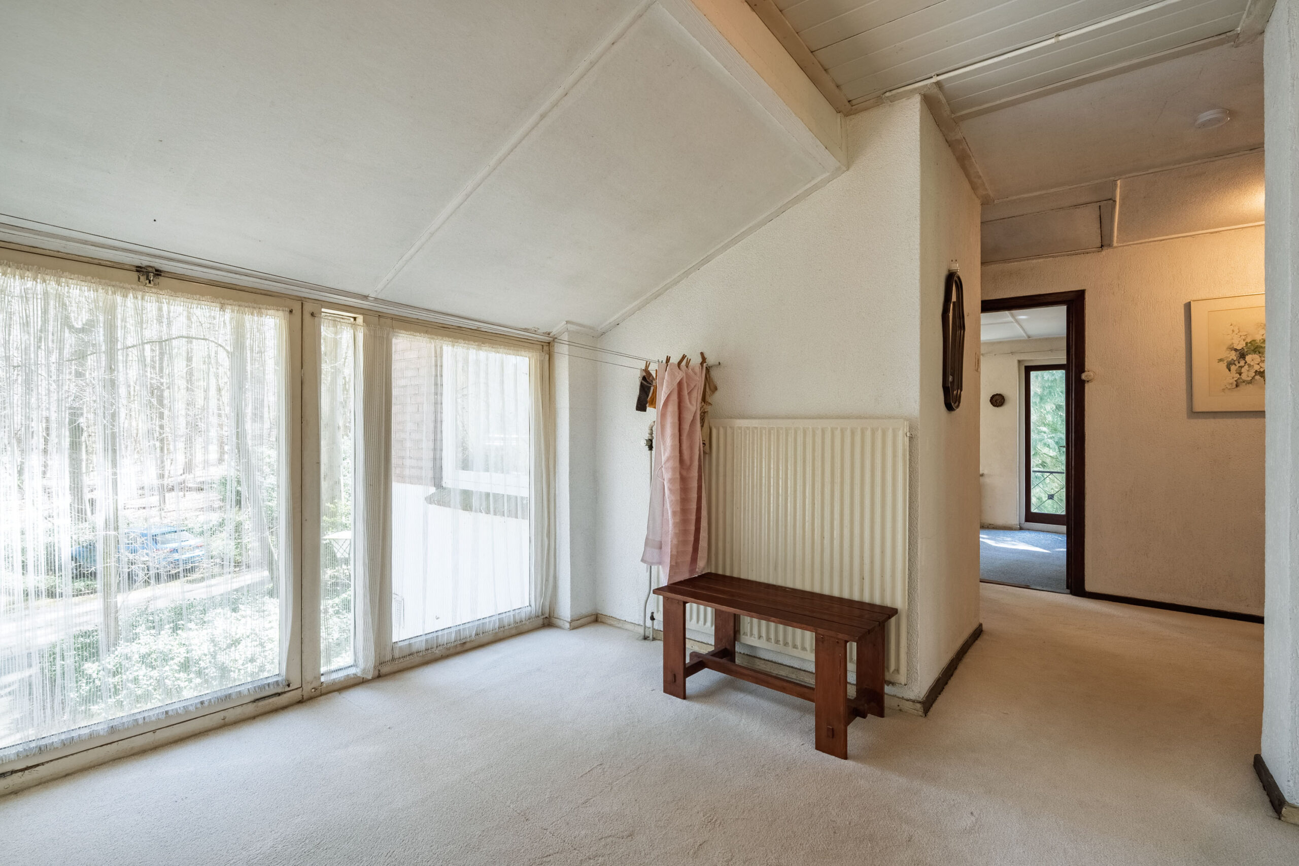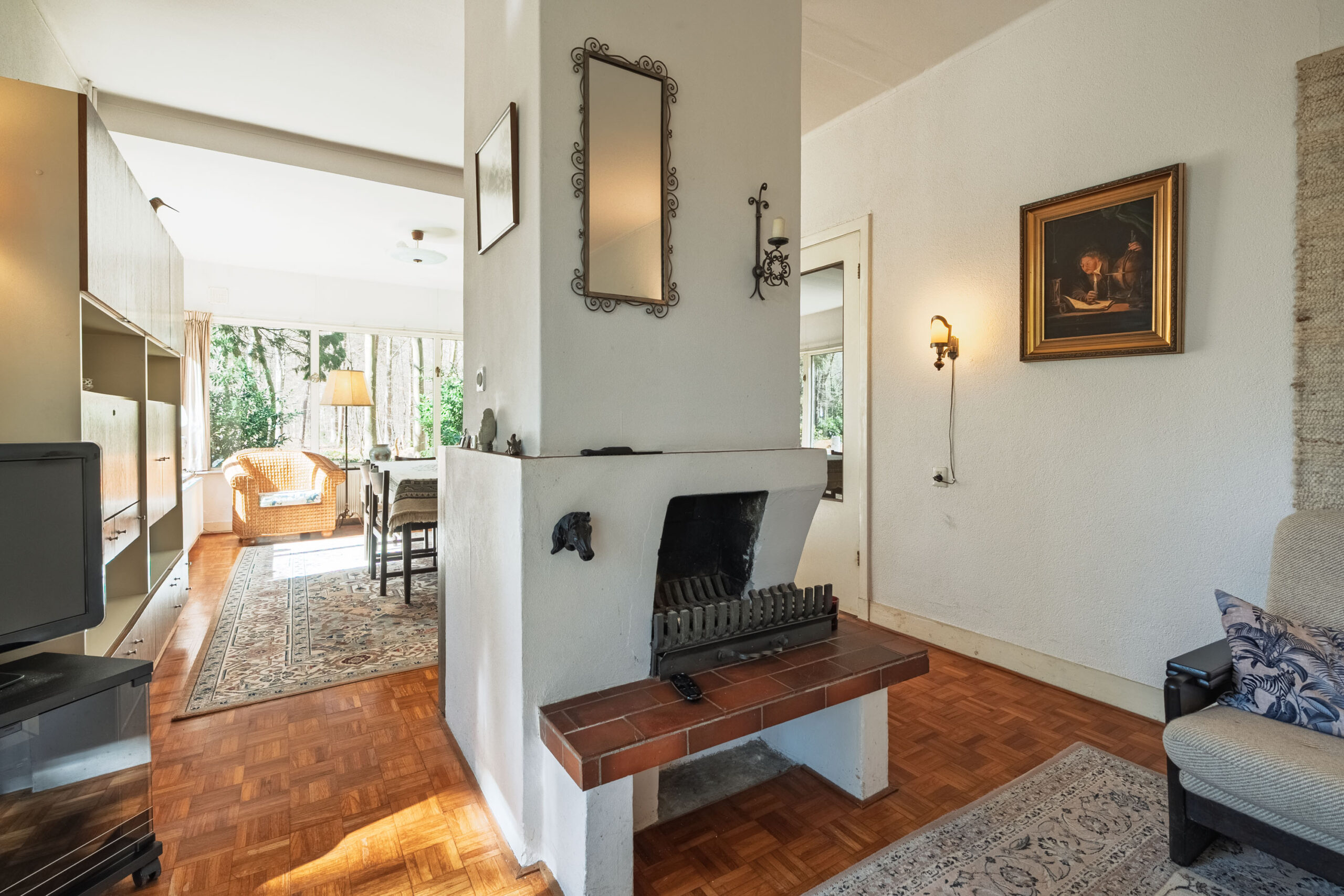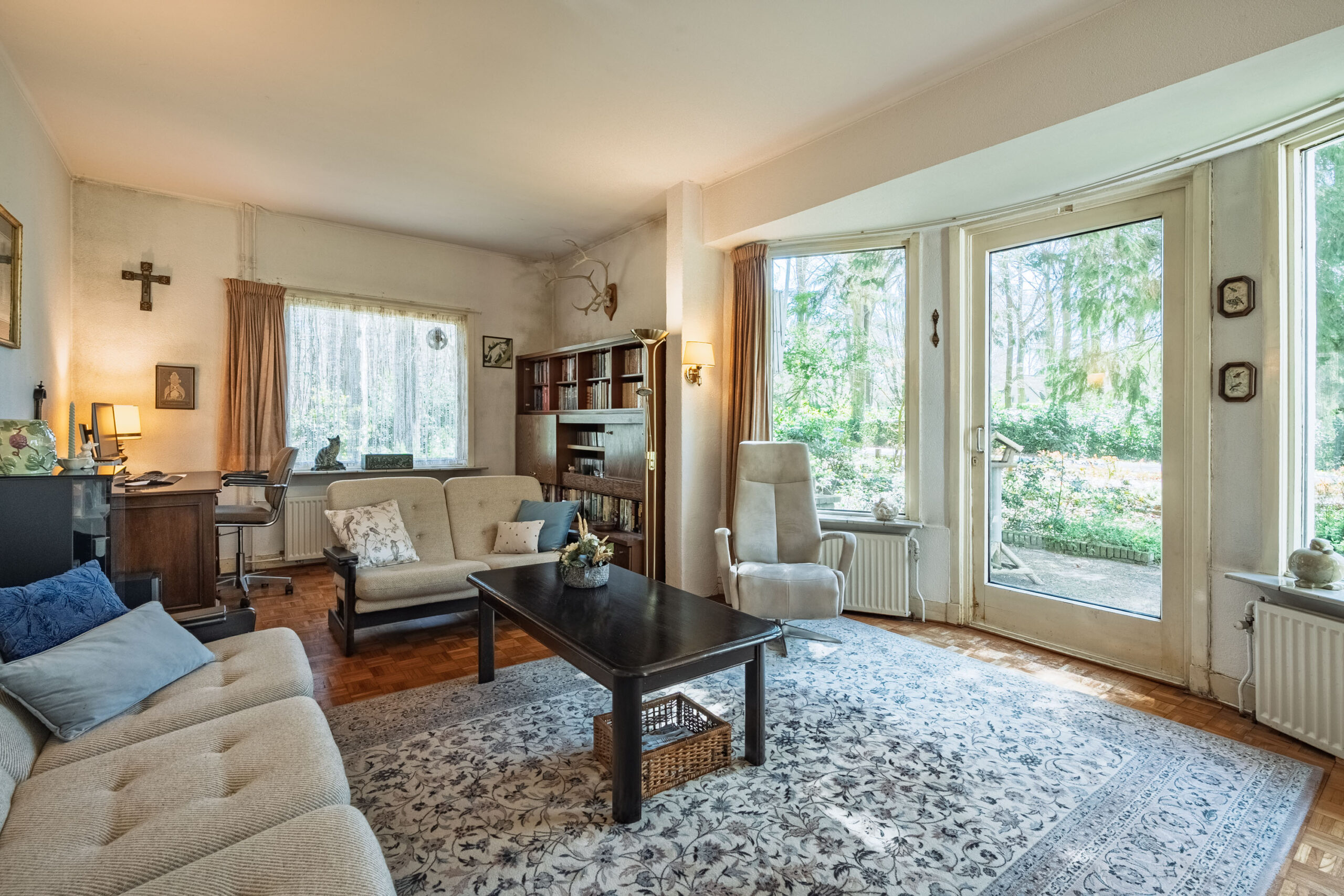 Aan de ene zijde van de woonkamer zorgen grote raampartijen voor een lichte, bijna serreachtige sfeer. Ze bieden niet alleen een fraai uitzicht op de omgeving, maar laten ook een overvloed aan daglicht binnen. De andere zijde is momenteel ingericht als zitkamer en beschikt over een erker met een deur naar buiten.