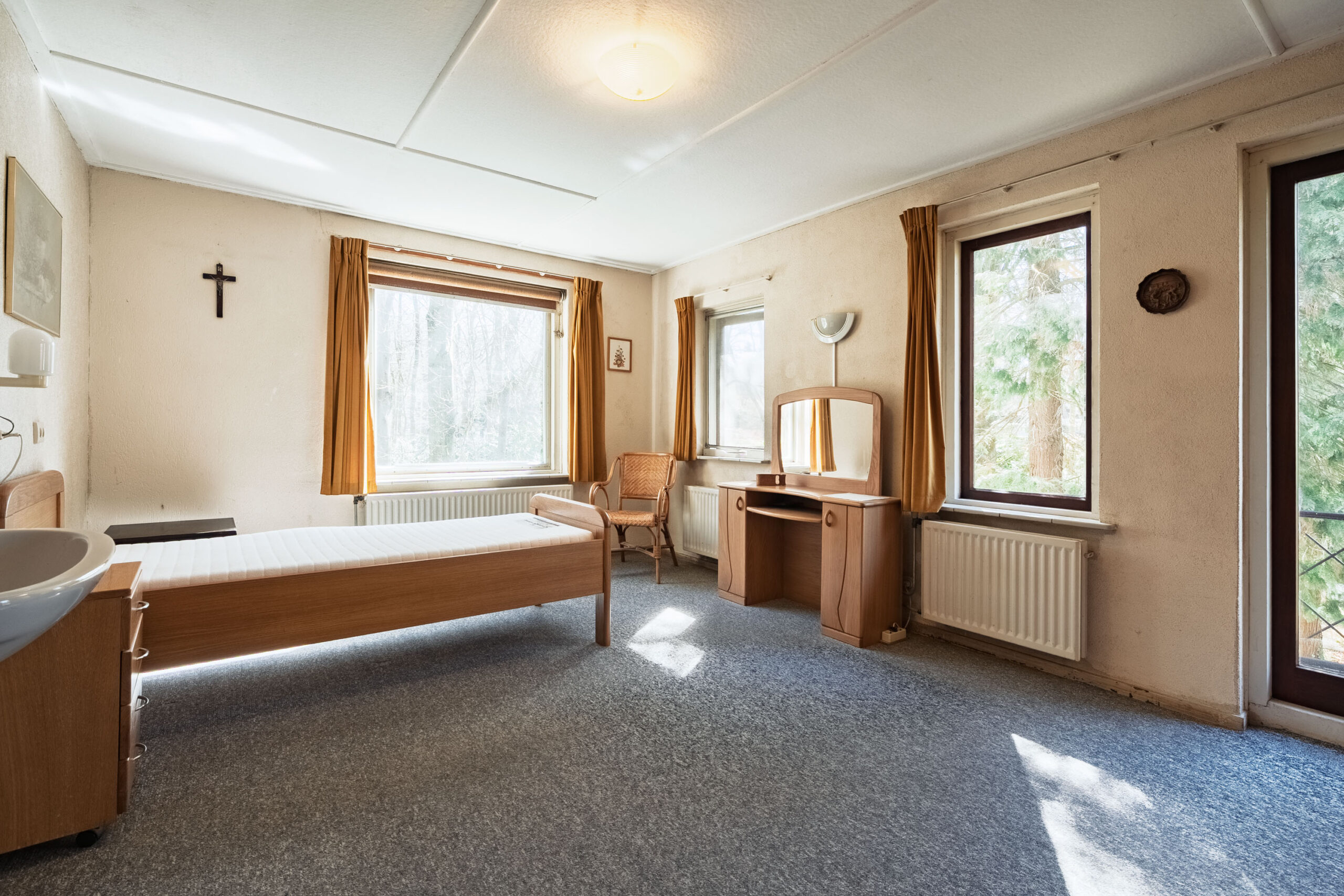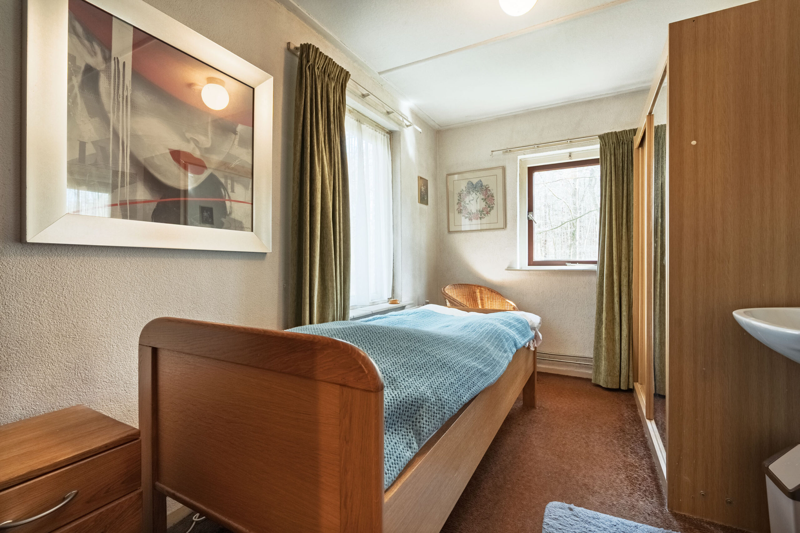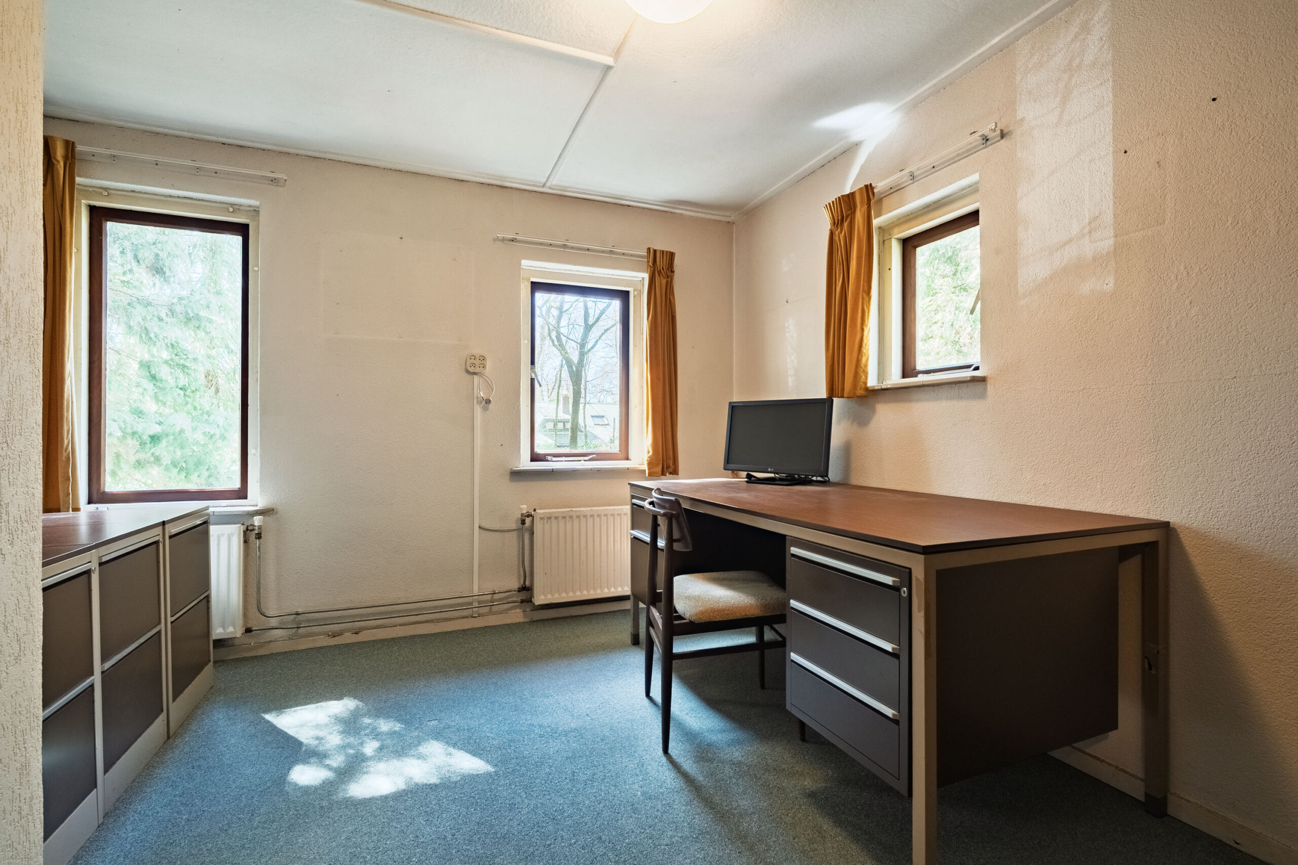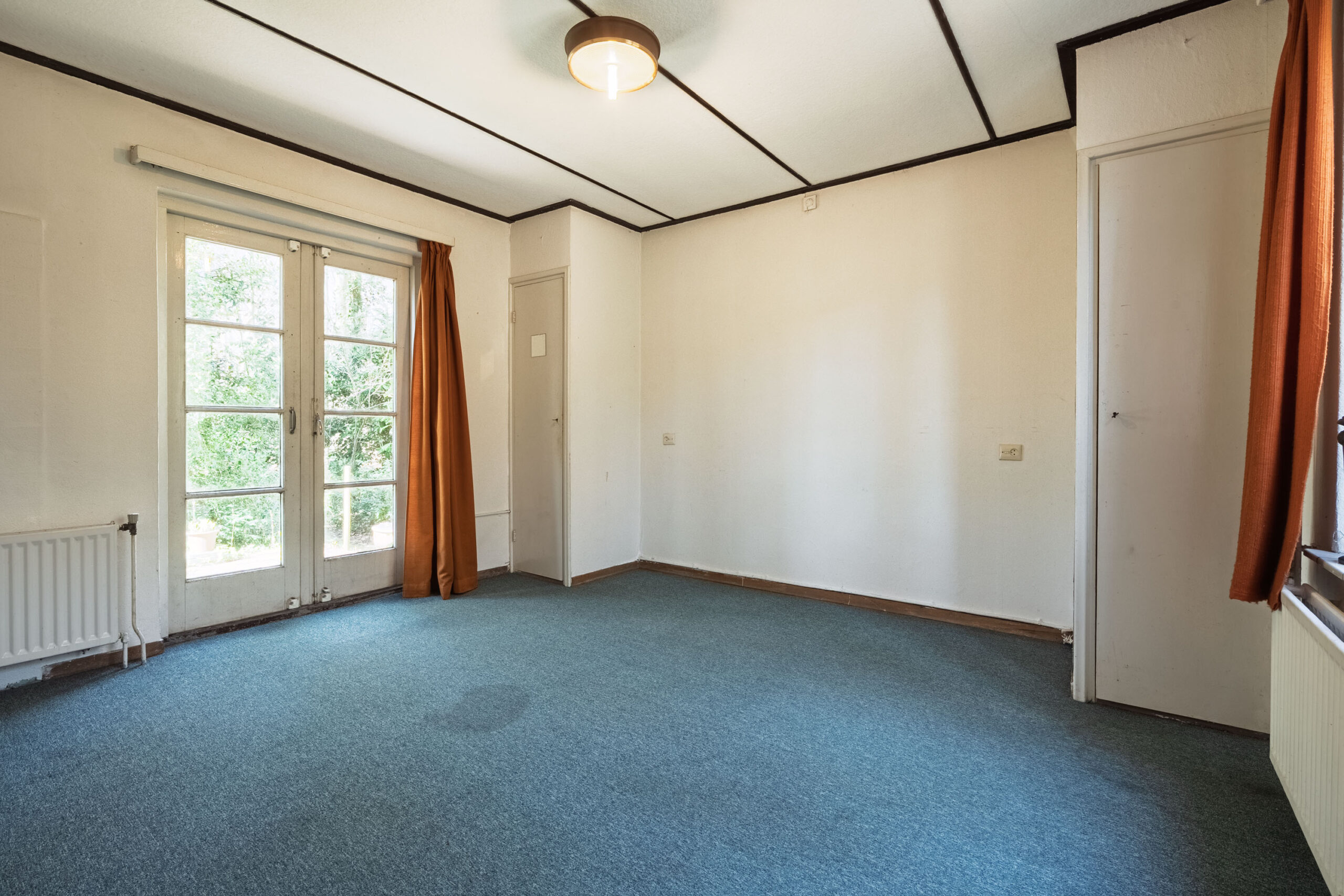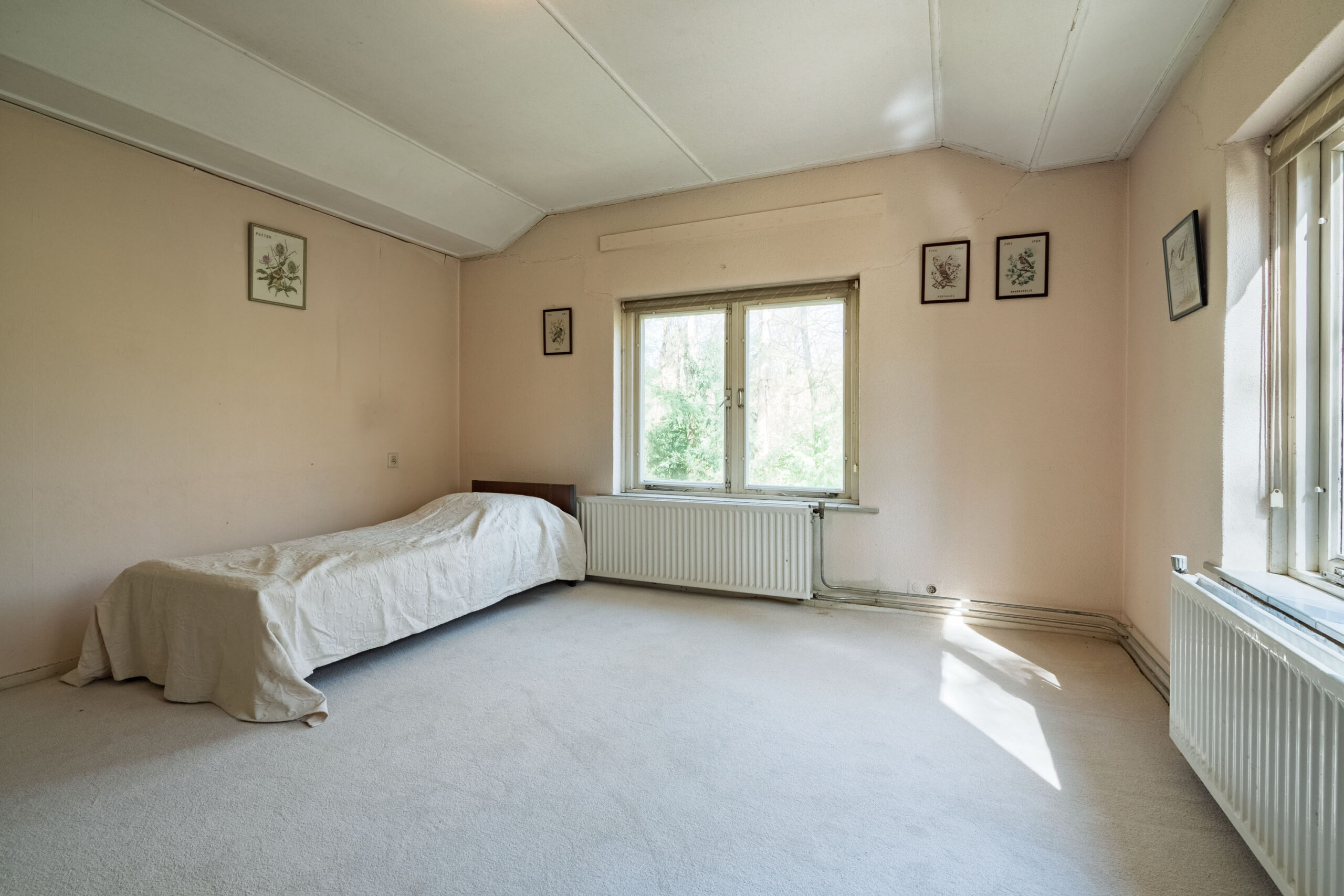 Aan de ene zijde van de woonkamer zorgen grote raampartijen voor een lichte, bijna serreachtige sfeer. Ze bieden niet alleen een fraai uitzicht op de omgeving, maar laten ook een overvloed aan daglicht binnen. De andere zijde is momenteel ingericht als zitkamer en beschikt over een erker met een deur naar buiten.