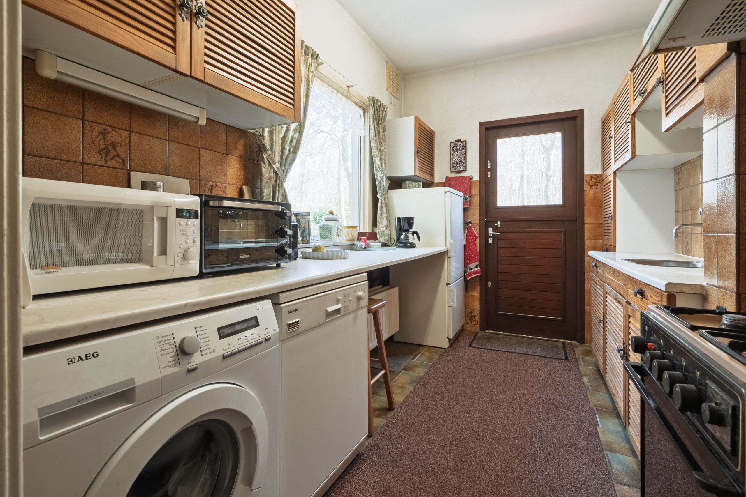Een dichte keuken met keukenblok, aansluitingspunten voor wasapparatuur en een deur naar buiten.