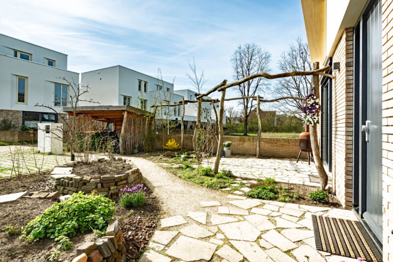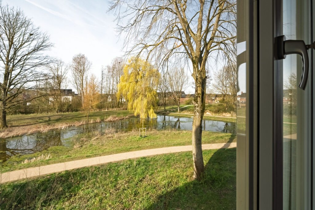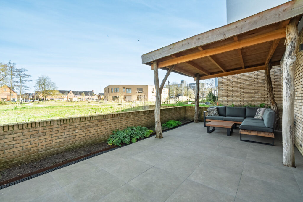 Aan de hofzijde is er een fijne tuin met ruim terras, inheemse beplanting, duurzaam opgebouwde pergola en overkapping waar onder meer de fietsen geplaatst kunnen worden. Er zijn reeds voorbereidingen getroffen voor het plaatsen van een laadpaal. Aan de parkzijde is er een verzorgd terras met keramische tegels en een charmante overkapping, waar je beschut kunt genieten van het buitenleven. De omgeving is groen en ruim opgezet, met diverse waterpartijen in de directe nabijheid. Hierdoor ervaar je hier dagelijks een ontspannen, bijna vakantieachtig gevoel.