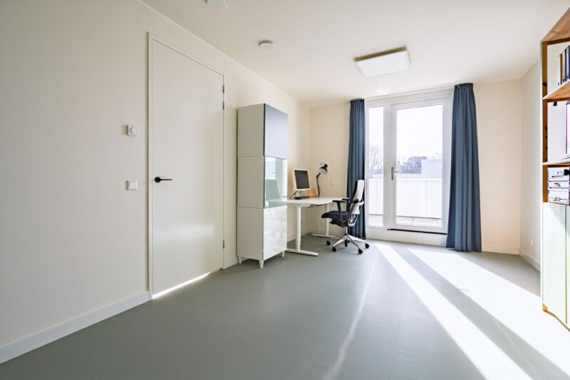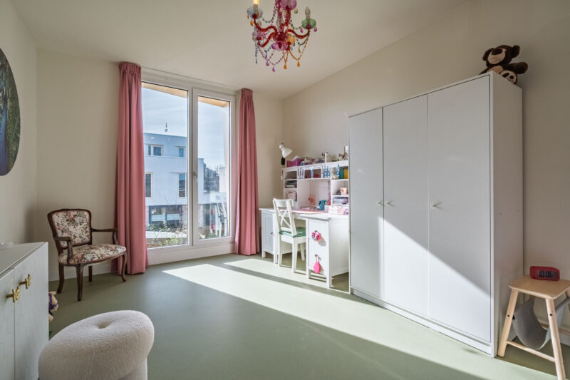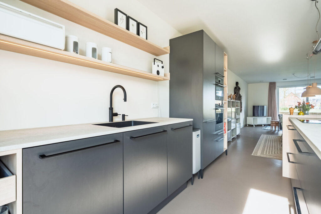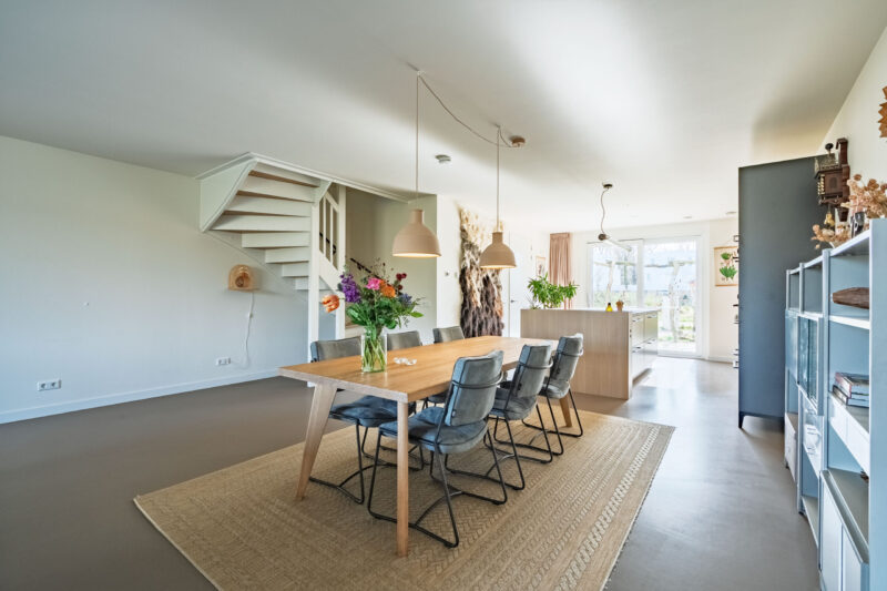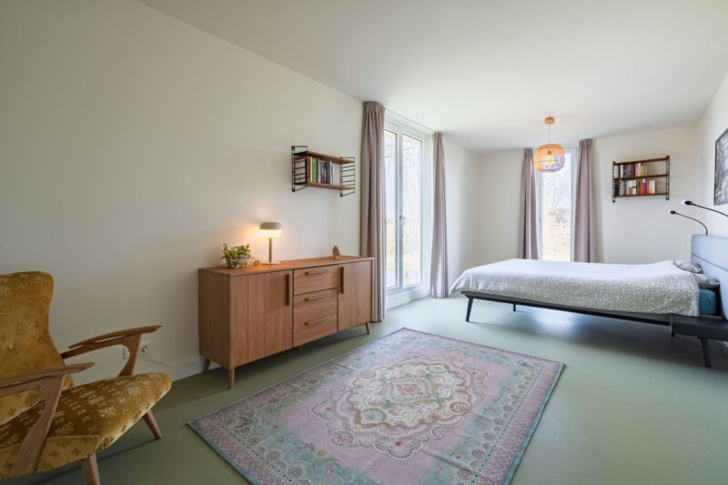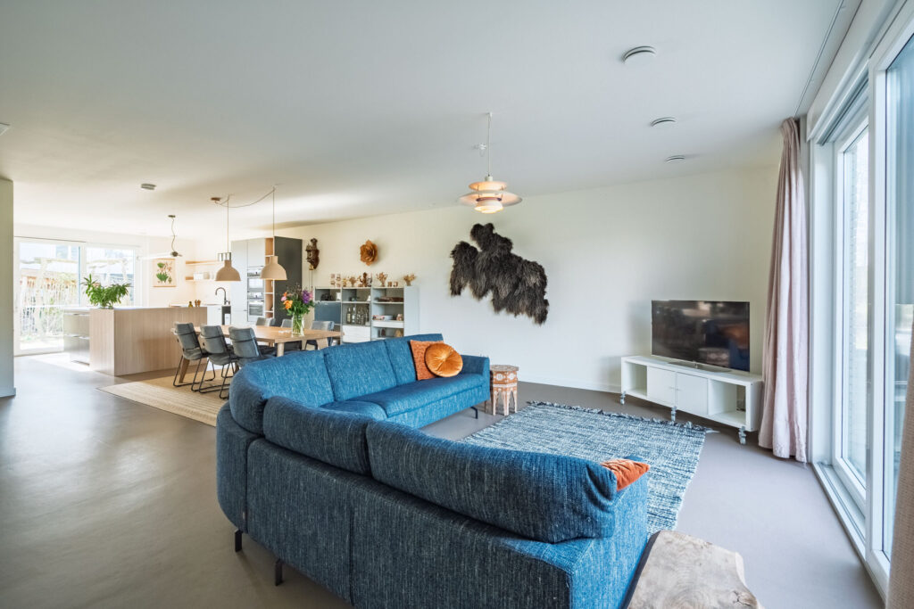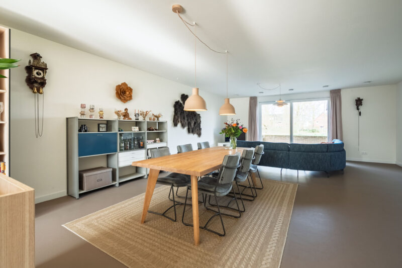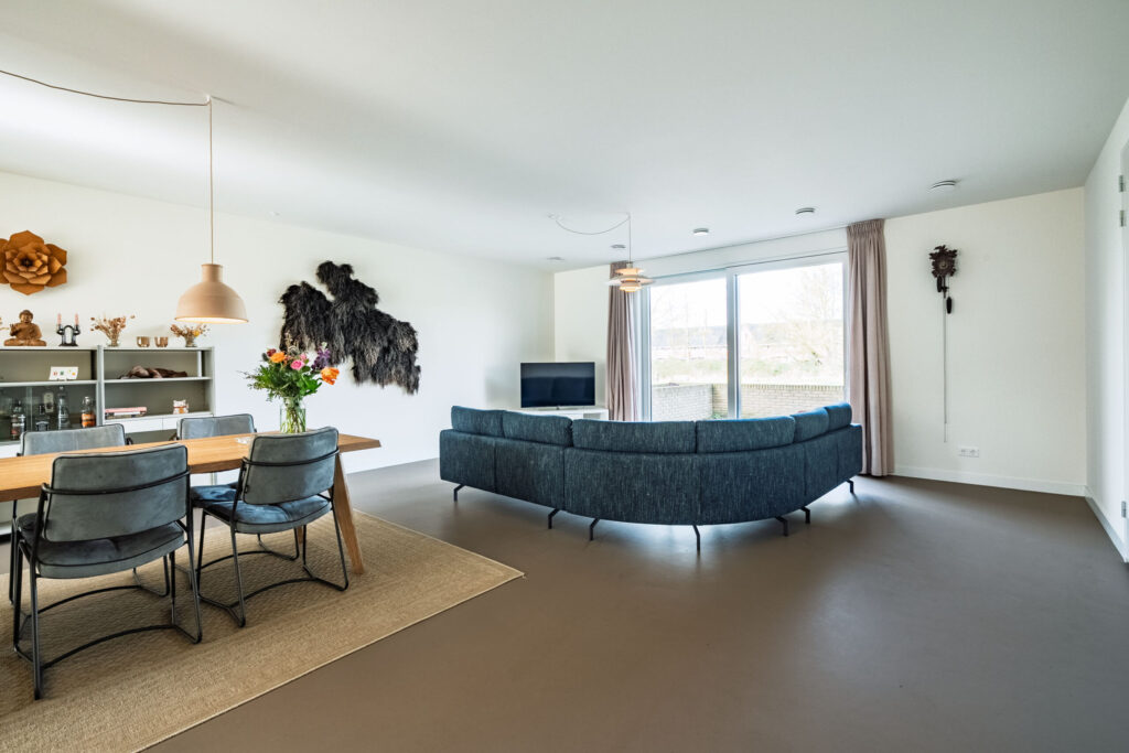 Zowel op de benedenverdieping als op de bovenverdiepingen zijn de leefruimtes afgewerkt met een strakke marmoleumvloer, wat zorgt voor een moderne en rustige uitstraling.