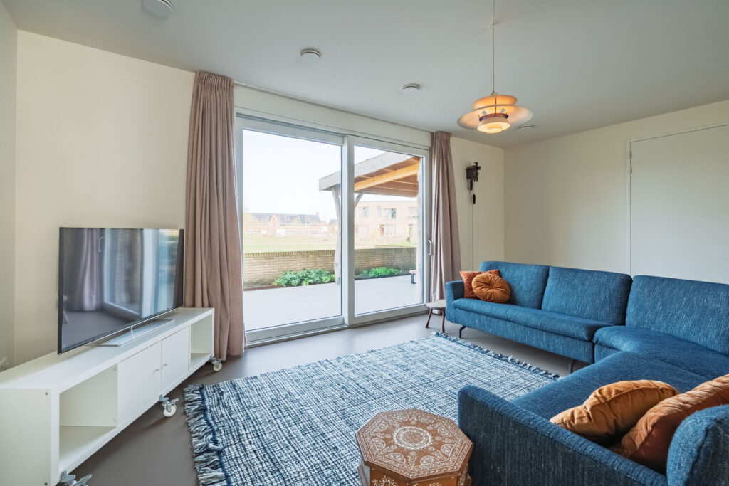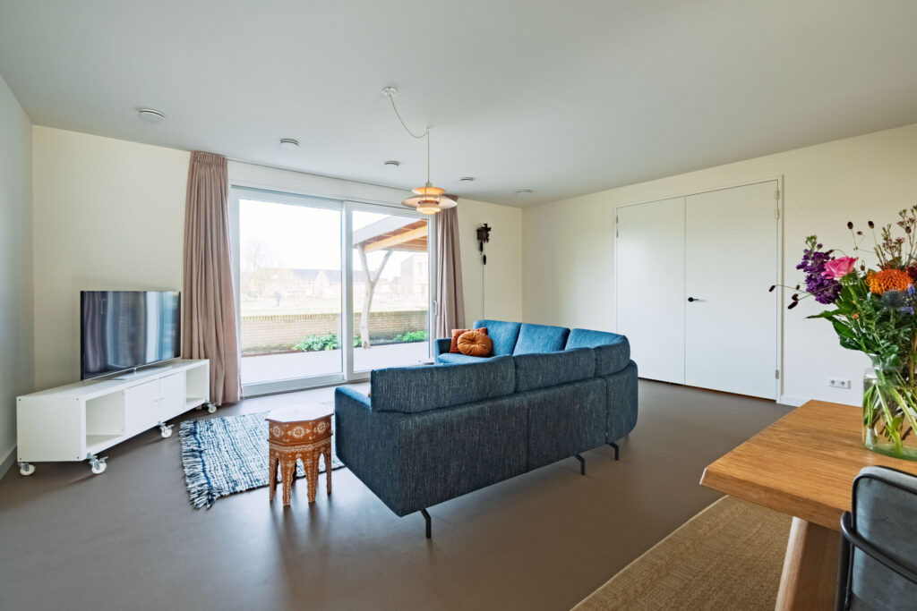 De aangrenzende woonkamer biedt een prachtig uitzicht op het terras en de groene, rustige parkomgeving. Dankzij de grote raampartijen en de brede schuifpui geniet je hier van veel lichtinval. Op mooie dagen zet je de schuifpui open en ontstaat er een heerlijk binnen-buitengevoel.