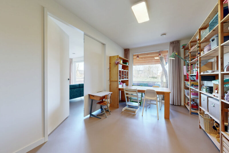 Via de woonkamer is nog een ruime kamer bereikbaar met een raampartij die tevens uitzicht biedt op het park. Thans is deze ruimte in gebruik als speelkamer, maar een werkkamer of andere bestemming behoort zeker tot de mogelijkheden.