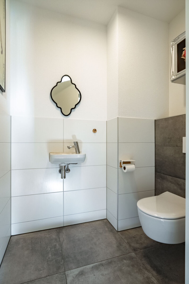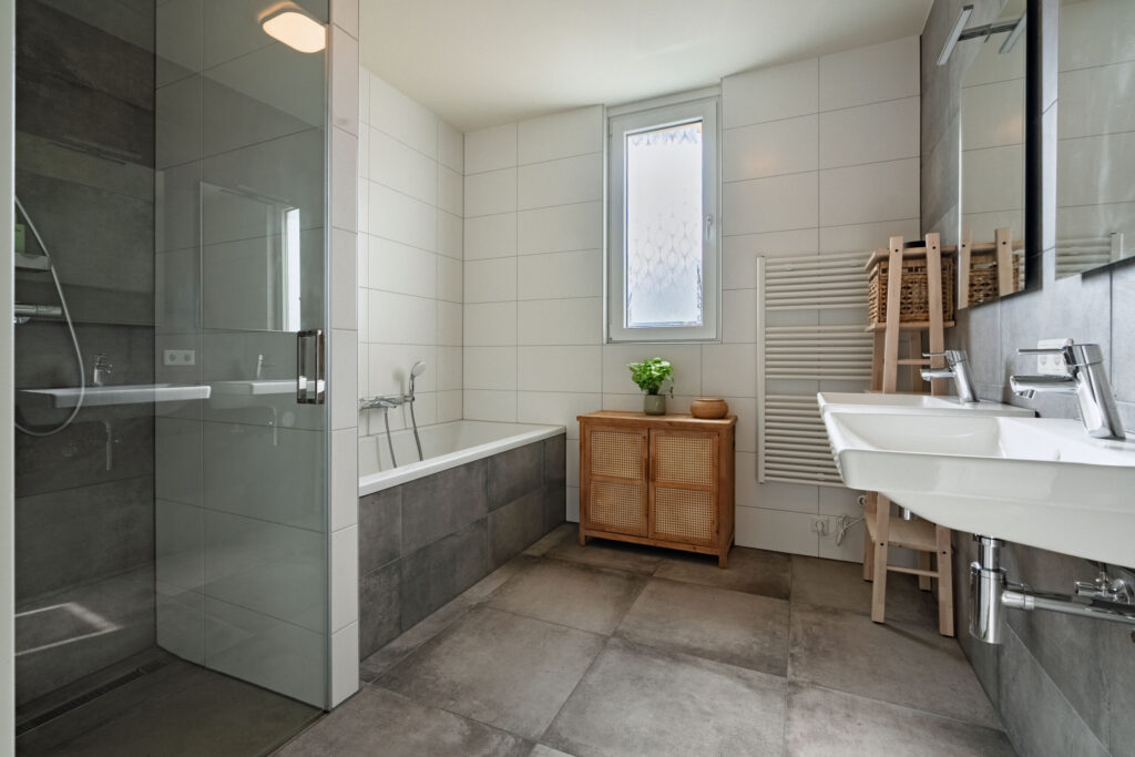 De moderne, betegelde badkamer is uitgerust met een dubbele wastafel, een ligbad en een inloopdouche. Op de overloop bevindt zich daarnaast een separaat toilet met fonteintje.