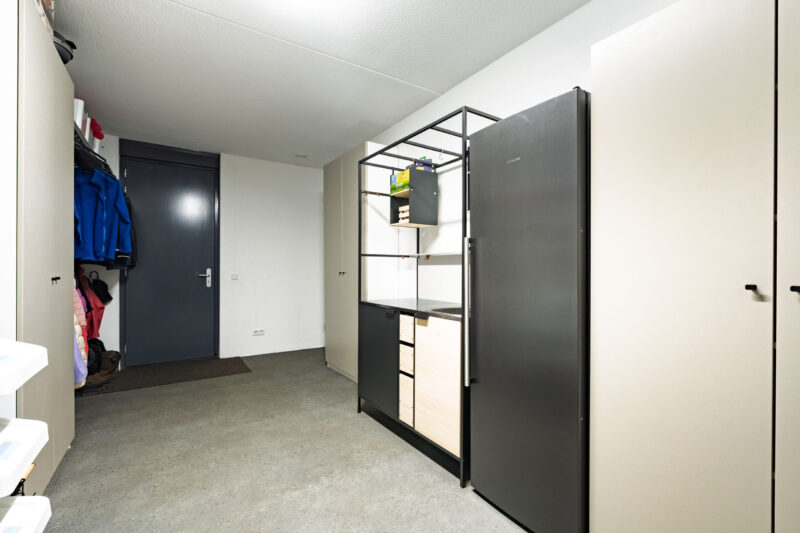 Bij binnenkomst kom je in de hal met toegang tot het toilet en de meterkast. Aan de rechterzijde bevindt zich de deur naar de inpandige berging met warmwatervoorziening, die volop ruimte biedt voor garderobe, fietsen en (tuin)gereedschap.