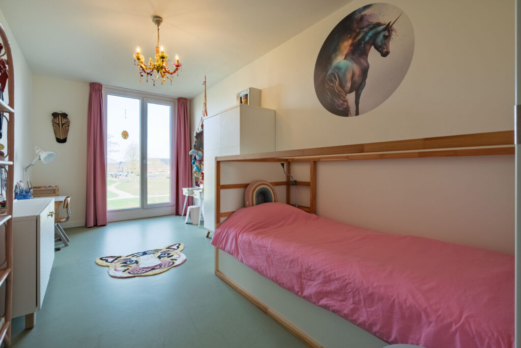 Via de overloop bereik je drie ruime slaapkamers. De kamers zijn voorzien van grote raampartijen, wat zorgt voor een prettige lichtinval en goede ventilatiemogelijkheden. De hoofdslaapkamer is met een oppervlakte van circa 23 m2 met recht een master bedroom te noemen. Via de grote ramen aan de achterzijde en de zijkant van de woning heb je een prachtig uitzicht op het park.