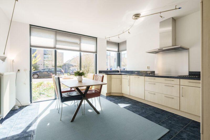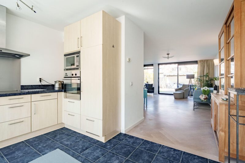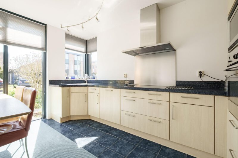 Via de verzorgde voortuin bereikt u de entree. In de hal bevinden zich een toilet met fonteintje, de meterkast en trapopgang. De ruime, tuingerichte woonkamer met aansluitend een tweede zitgedeelte is voorzien van een stijlvolle massief eiken visgraatvloer. De halfopen keuken is gelegen aan de voorzijde van de woning, uitgevoerd in een hoekopstelling en voorzien van verschillende inbouwapparatuur, te weten; een kookplaat, afzuigkap, combimagnetron, oven, koelkast en een vaatwasser. De keuken is afgewerkt met vloertegels.
