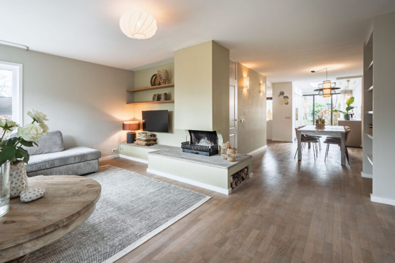 Begane grond: ruime entree, hal met trapopgang naar de verdieping, meterkast en toiletruimte met fonteintje. De royale woonkamer is voorzien van een sfeervolle open haard en een ruime eethoek. De woning is aan de achterzijde uitgebouwd wat zorgt voor een ruimtelijk en licht geheel.