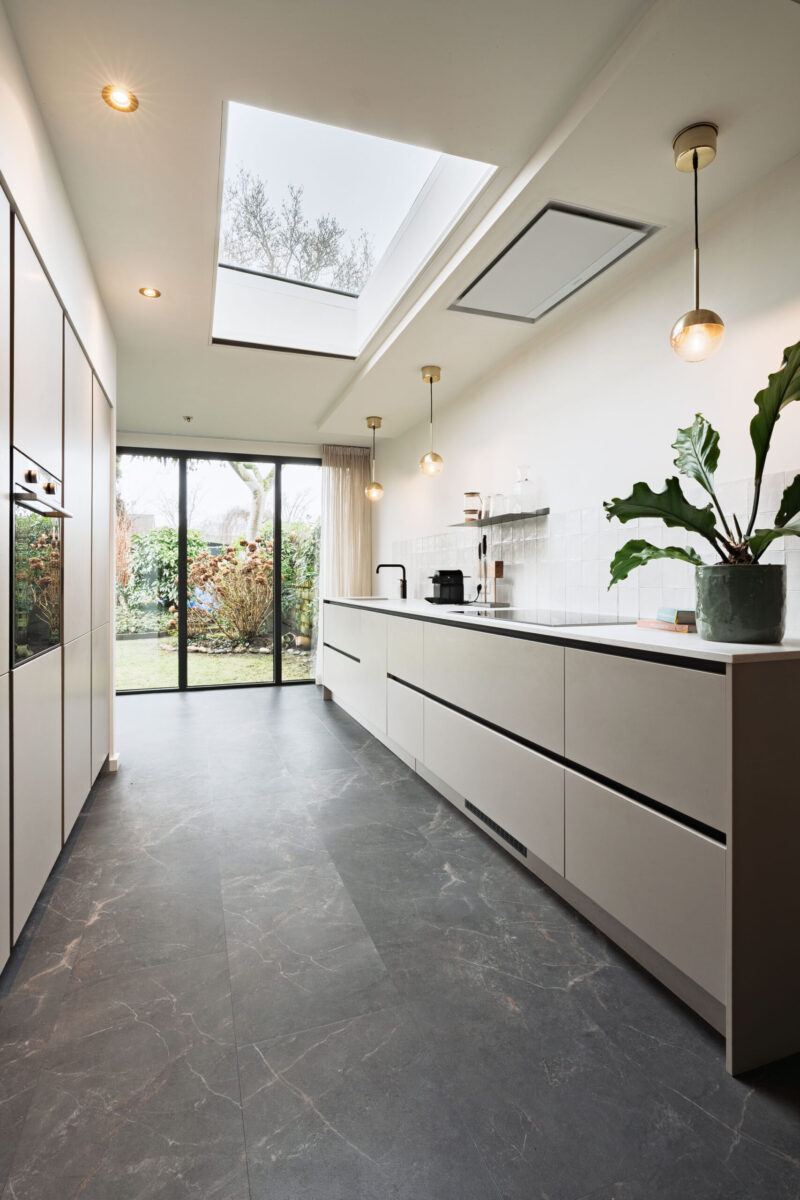 De open keuken is voorzien van diverse inbouwapparatuur, waaronder een inductiekookplaat, afzuigkap, vaatwasser en Quooker. De combi-oven en de koel-/vriescombinatie zijn fraai verwerkt in een wandkast. Vanuit de keuken is de praktische trapkast/provisieruimte bereikbaar.