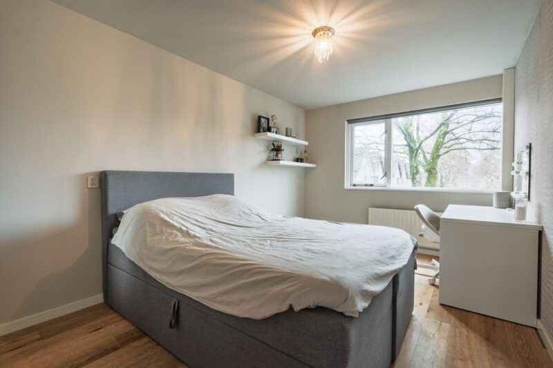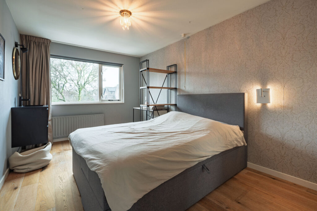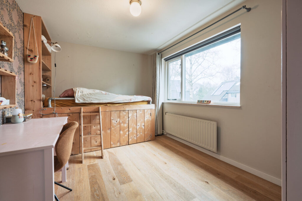 Op deze verdieping bevinden zich vier slaapkamers, waarvan twee met vaste kastruimte. De ruimte boven de garage is in gebruik als vierde slaapkamer.