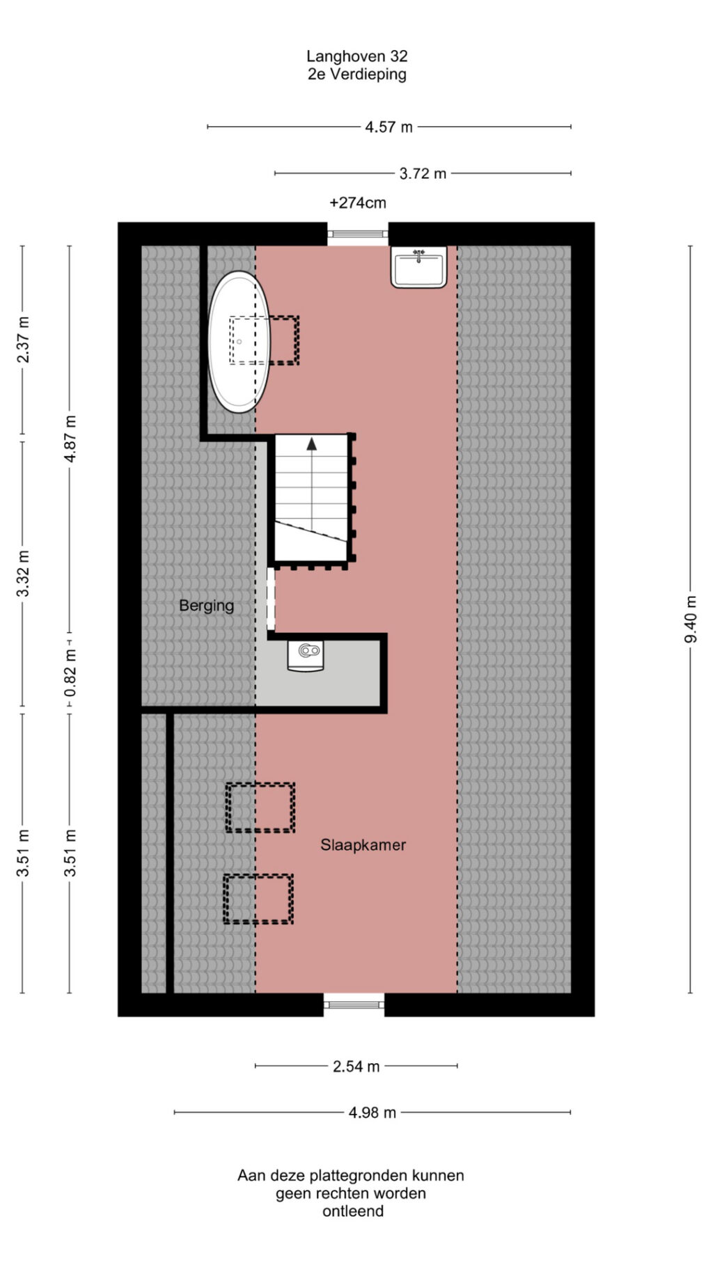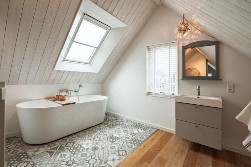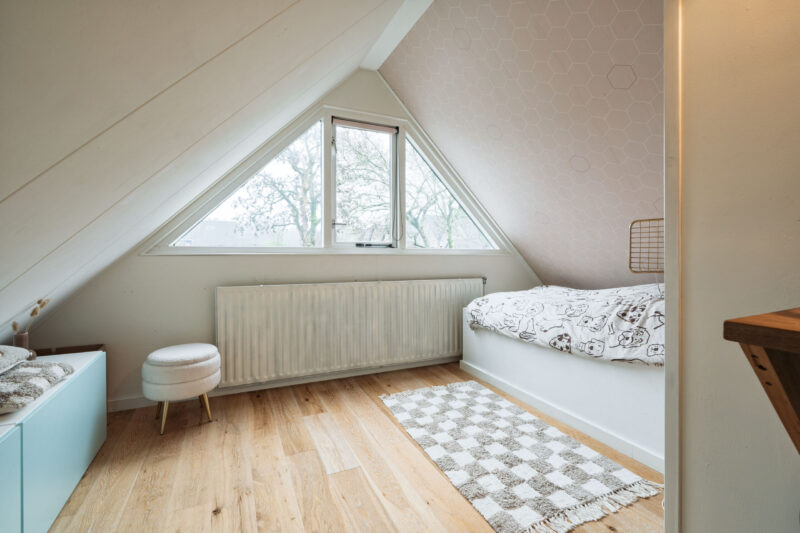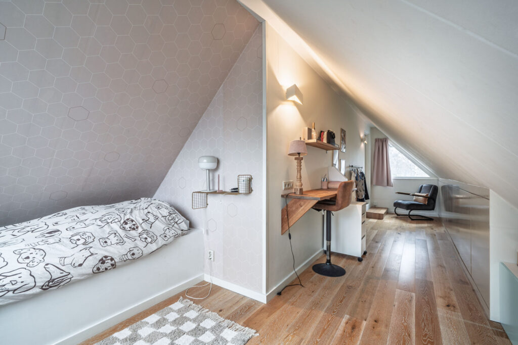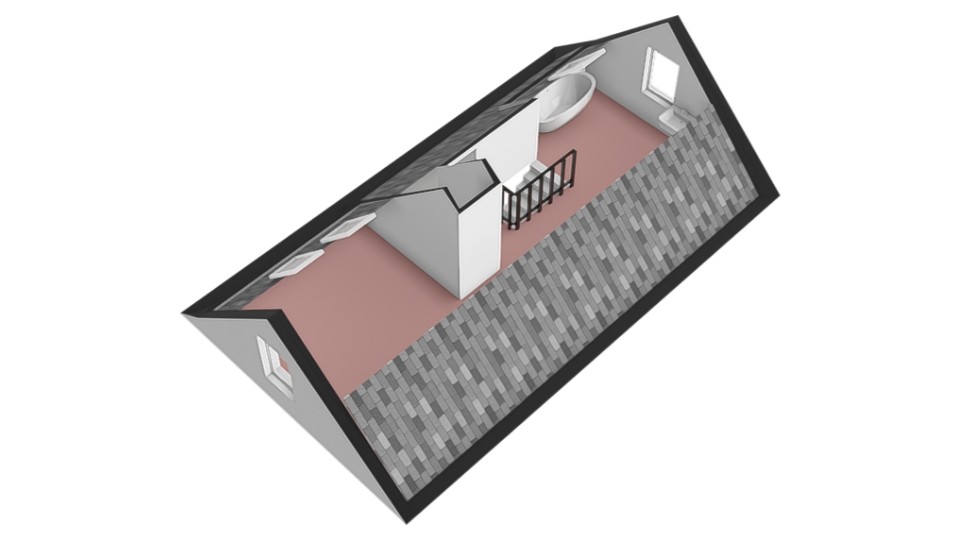 Tweede verdieping: Ruime vijfde slaapkamer met ligbad, wastafelmeubel en dakramen. Daarnaast is er een praktische bergruimte aanwezig met de cv-installatie.