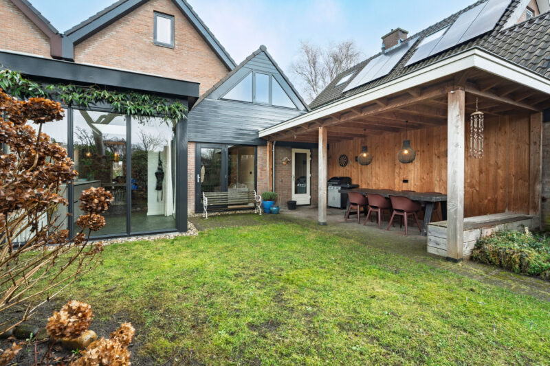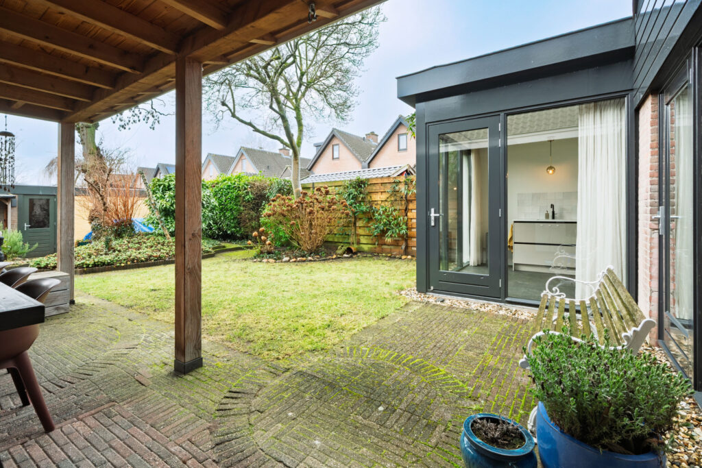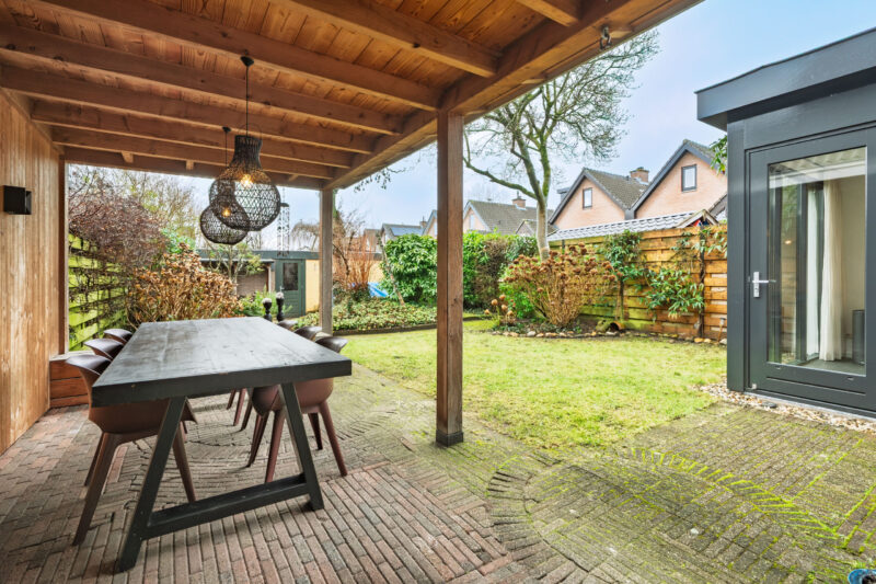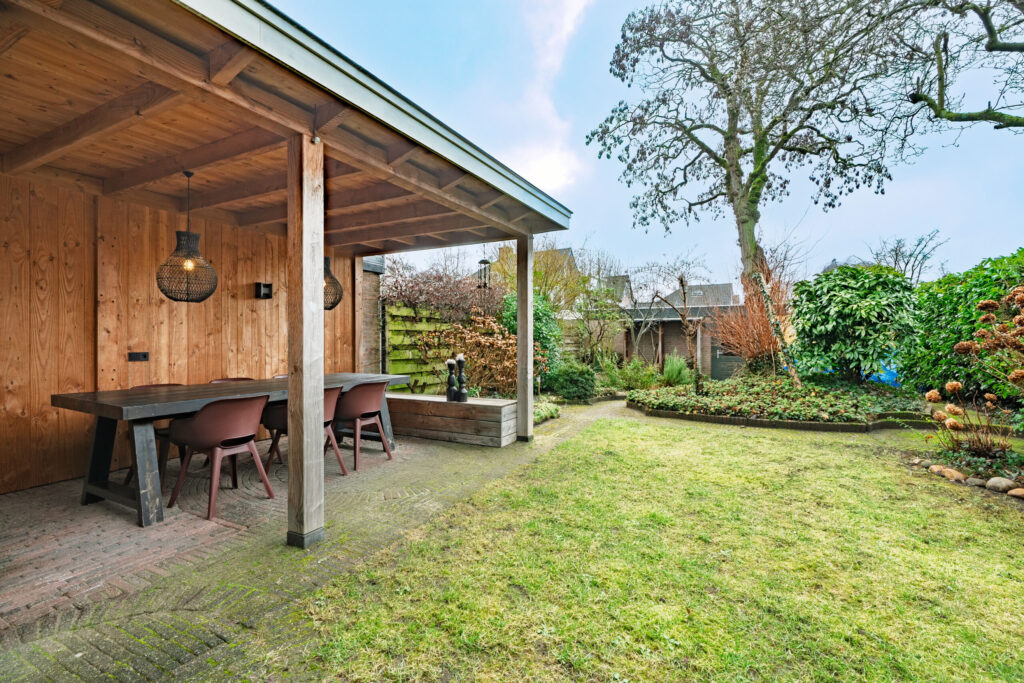 De zonnige achtertuin met houten veranda en tweede garage biedt volop privacy en heeft een eigen achterom.