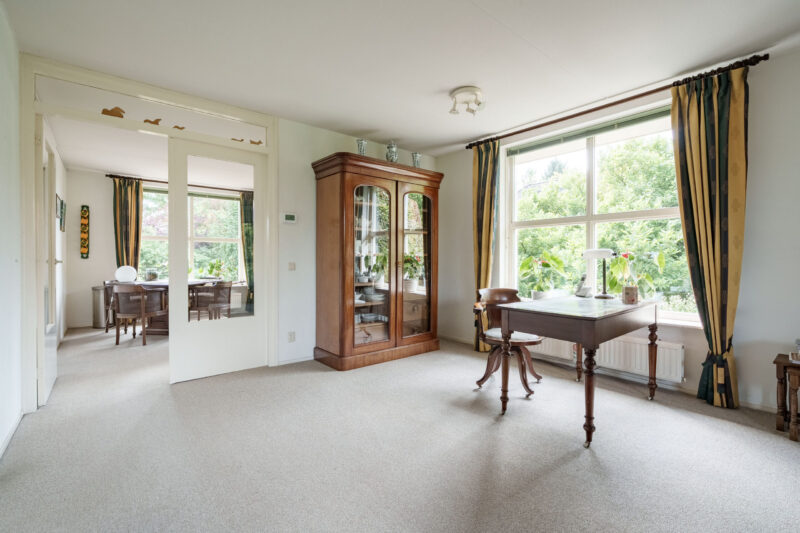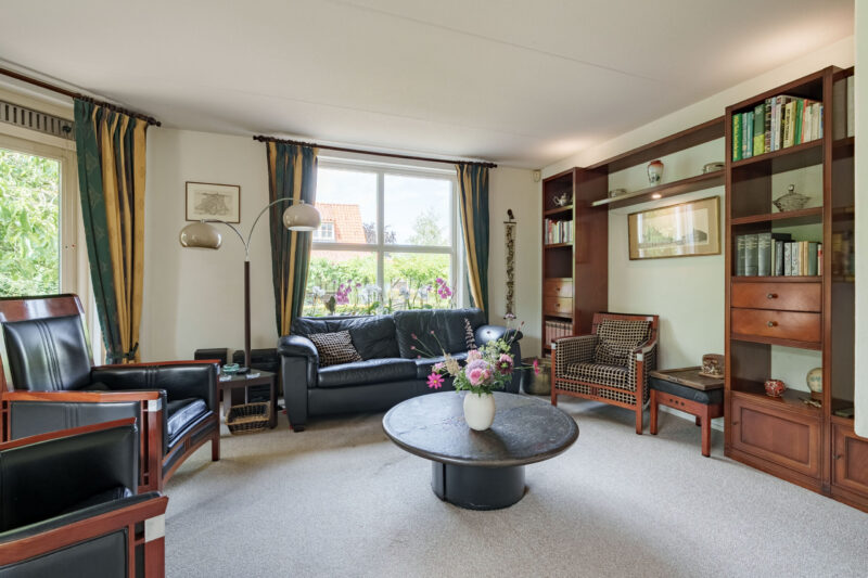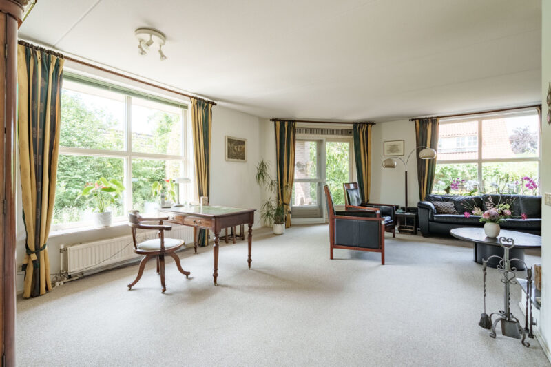 Begane grond: entree, ontvangsthal, royale lichte woonkamer met veel daglicht en mooi uitzicht op de tuin. De raampartijen met roedeverdeling geven een warme sfeer. De woonkamer heeft een houthaard en via de tuindeur is de achtertuin te betreden.