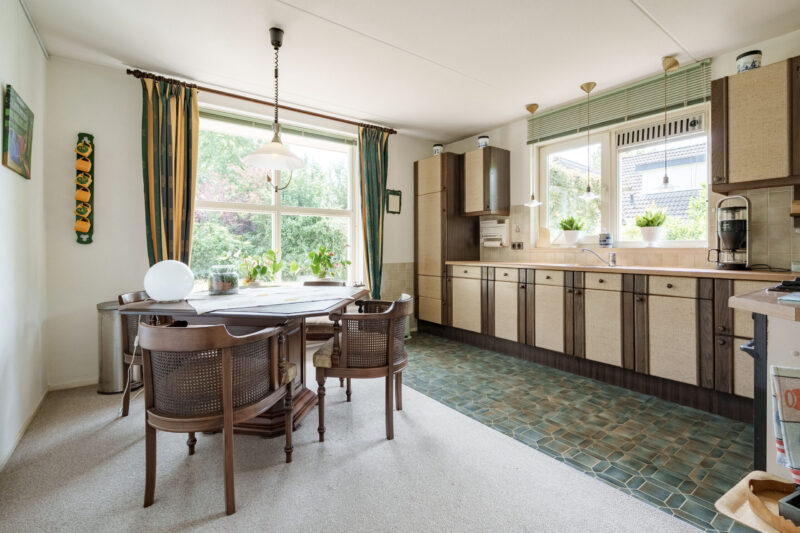 Via de woonkamer is toegang tot de eetkeuken met een L-vormige keukenopstelling en apparatuur, te weten: koelkast, gasfornuis, oven een vlakscherm afzuigkap. Via de hal is bereikbaar: de werkkamer (ca. 16 m²), toilet met fontein, bijkeuken met achteringang, een kitchenette, aansluiting voor wasapparatuur en een vaste kast met daarin de C.V.-gas combiketel.