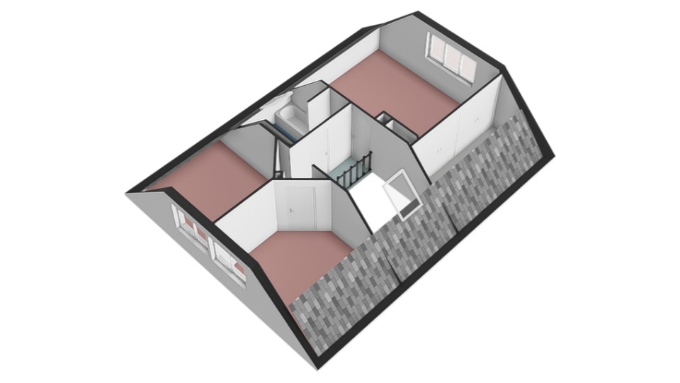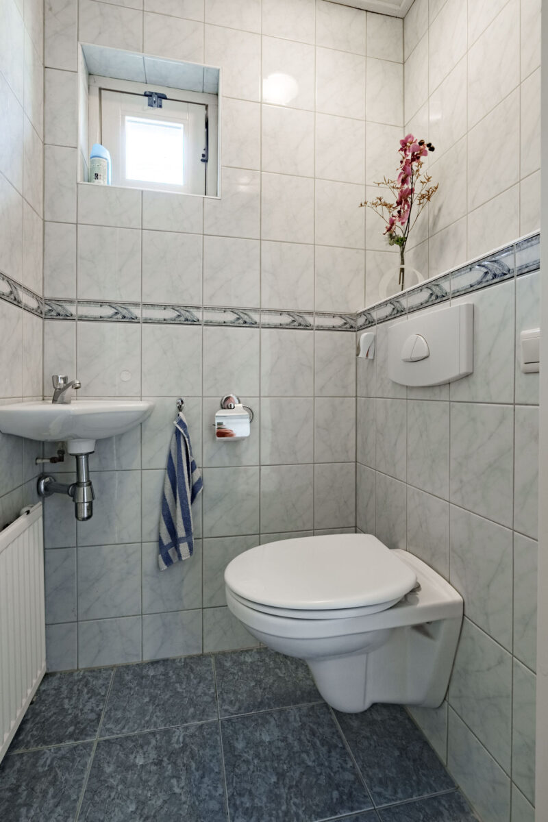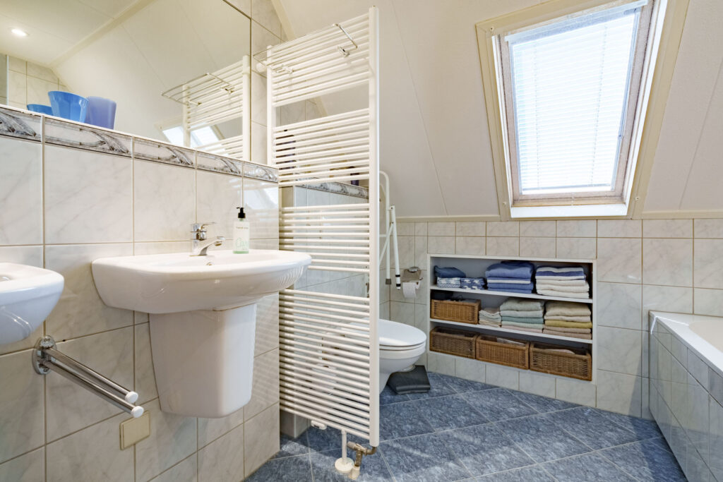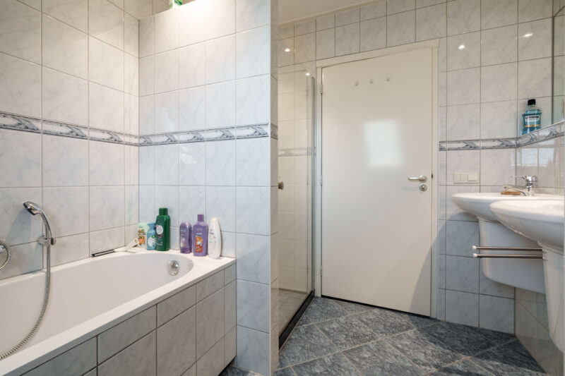 Verdieping: overloop met dakraam, royale slaapkamer (ca. 20 m²) met praktische opbergruimte achter schuifwandkasten. Badkamer met een dakraam, ligbad, separate douchehoek, dubbele wastafels en een tweede toilet, slaapkamer 2 en slaapkamer 3.