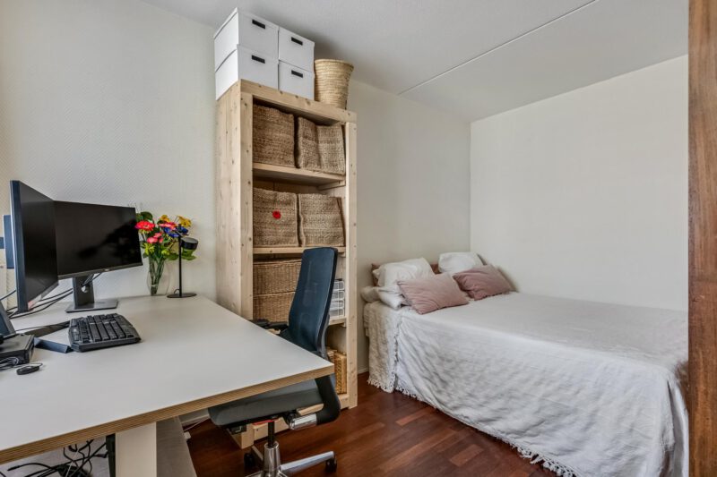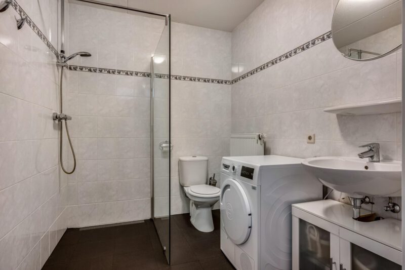 Een slaapkamer is gelegen aan de galerijzijde, de andere slaapkamer aan de achterzijde van het appartement. De badkamer is uitgevoerd in een lichte kleurstelling en tot het plafond betegeld voorzien van een inloopdouche, vaste wastafel en een 2e toilet.