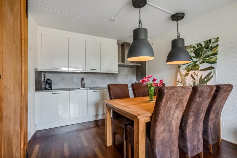 De moderne open keuken in lichte kleurstelling is voorzien van praktisch lades en diverse inbouwapparatuur te weten: inductiekookplaat, afzuigkap en vaatwasmachine.