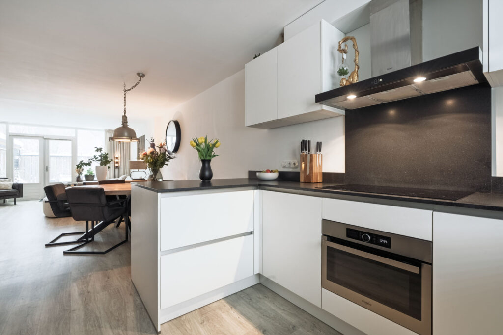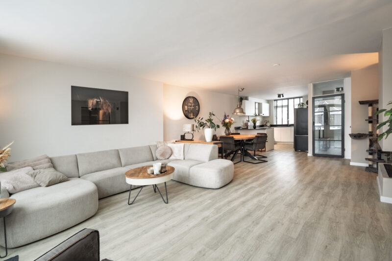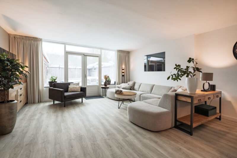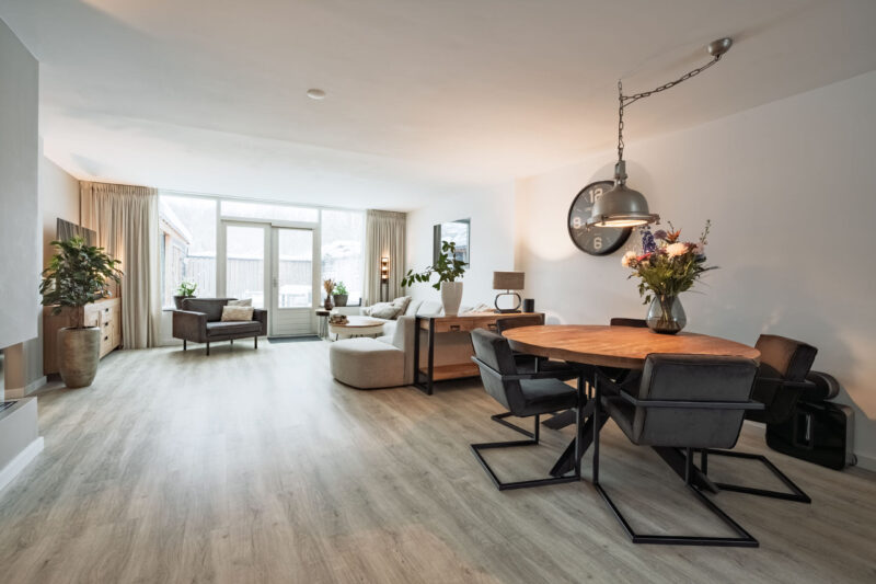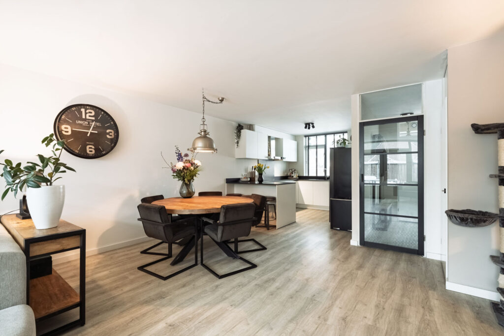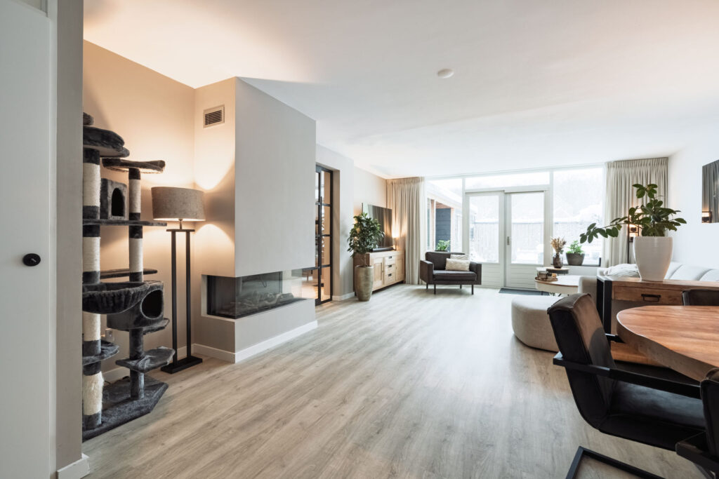 De woonkamer is in 2020 uitgebouwd en heeft een praktische indeling. De gashaard zorgt voor extra sfeer en comfort. De pvc-vloer loopt vanuit de keuken door in de woonkamer, waardoor de begane grond een mooi en samenhangend geheel vormt. De openslaande deuren zorgen voor een prettige verbinding tussen binnen en buiten. Dankzij de grote raampartijen aan de achterzijde is de woonkamer heerlijk licht.