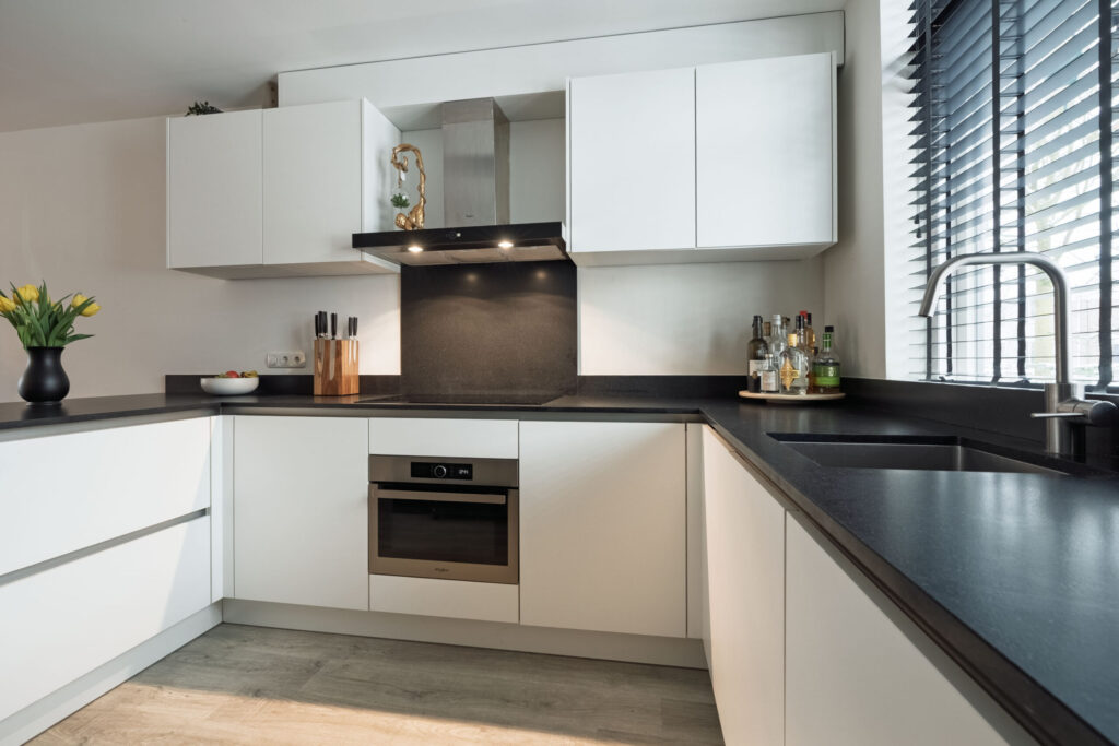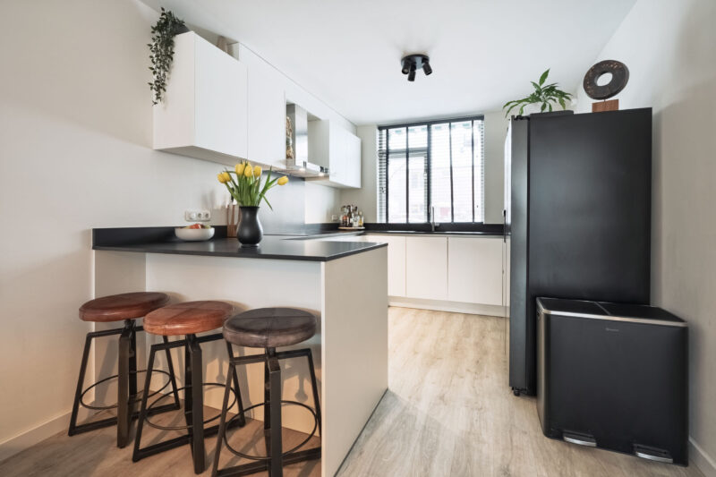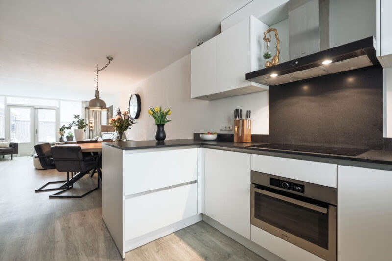 Via de hal betreedt u de woning. Hier bevinden zich de meterkast, de trapopgang naar de verdiepingen en een toiletruimte met fonteintje. Aan de voorzijde van de woning is de keuken gesitueerd, welke in 2020 volledig is vernieuwd. De keuken heeft een witte afwerking en beschikt over een gezellig barretje. De inbouwapparatuur, eveneens uit 2020, bestaat uit een inductiekookplaat, afzuigkap, combi-oven/magnetron, koel-/vriescombinatie en een vaatwasser.