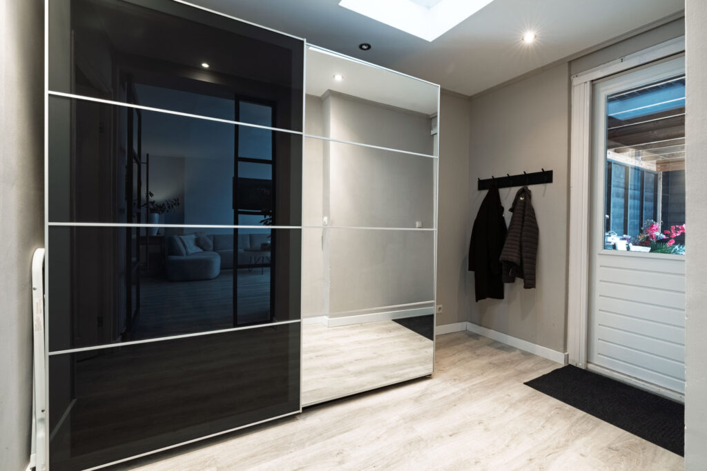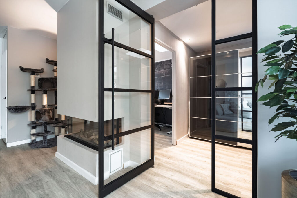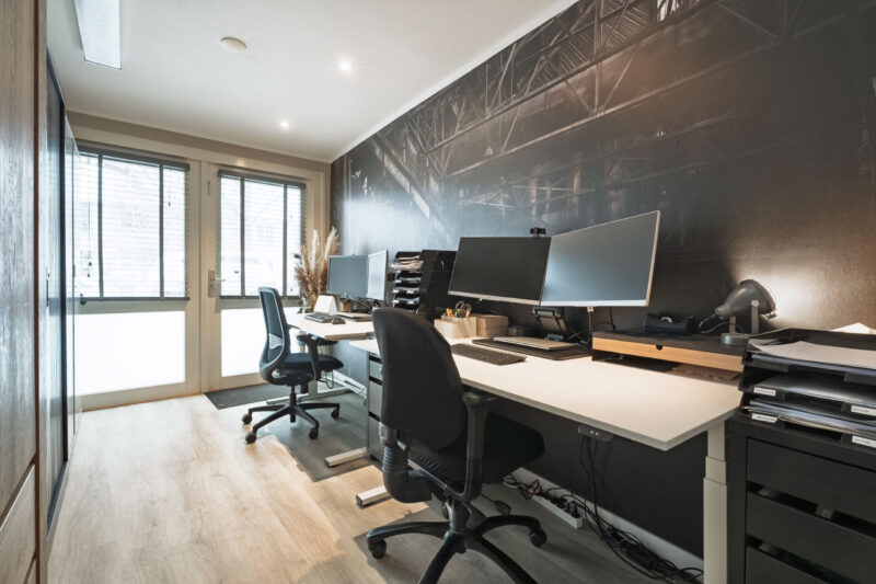 Moderne taatsdeuren geven toegang tot de aangrenzende ruimtes. Aan de zijkant van de woning is een werkruimte gerealiseerd, wat de woning zeer geschikt maakt voor thuiswerken of het uitoefenen van een praktijk aan huis.