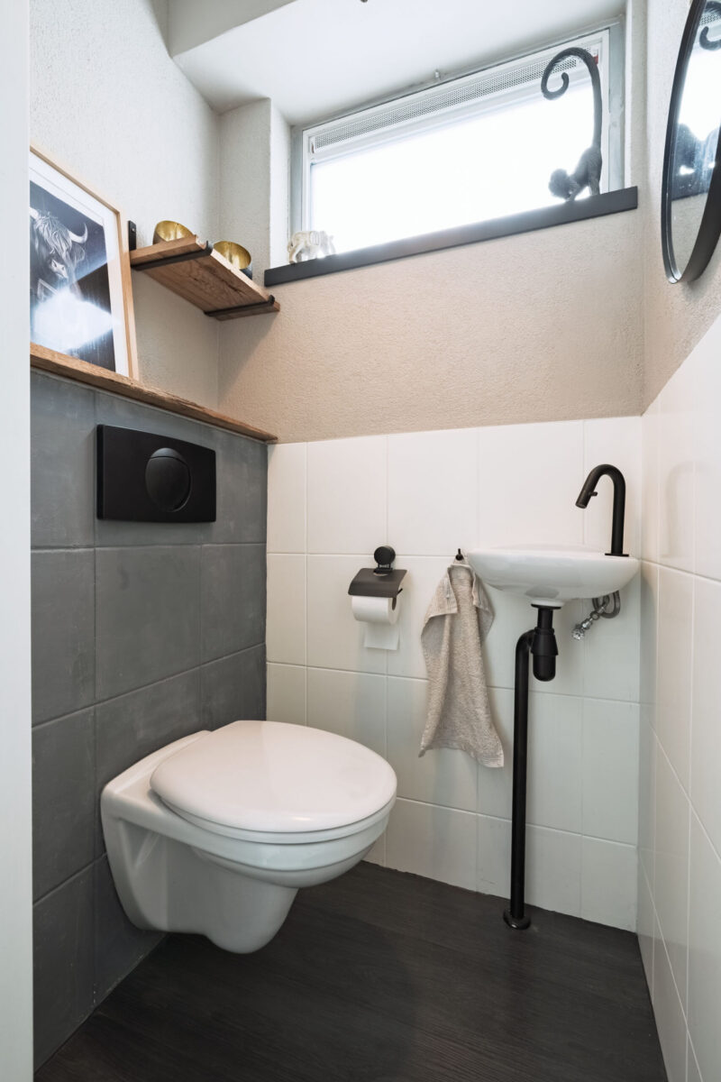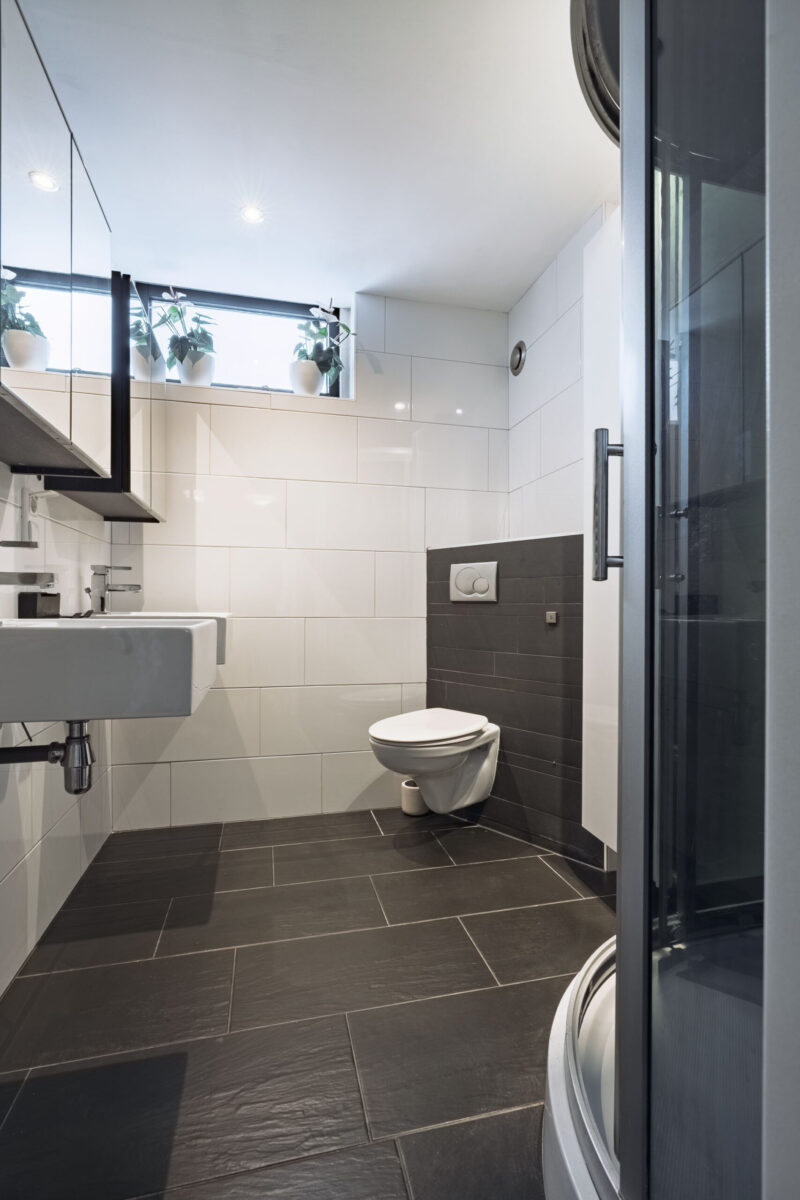 De modern betegelde badkamer is voorzien van een douche, een dubbele wastafel en een toilet. Het raam zorgt voor natuurlijke ventilatie en extra daglicht.