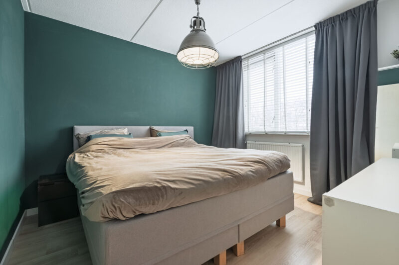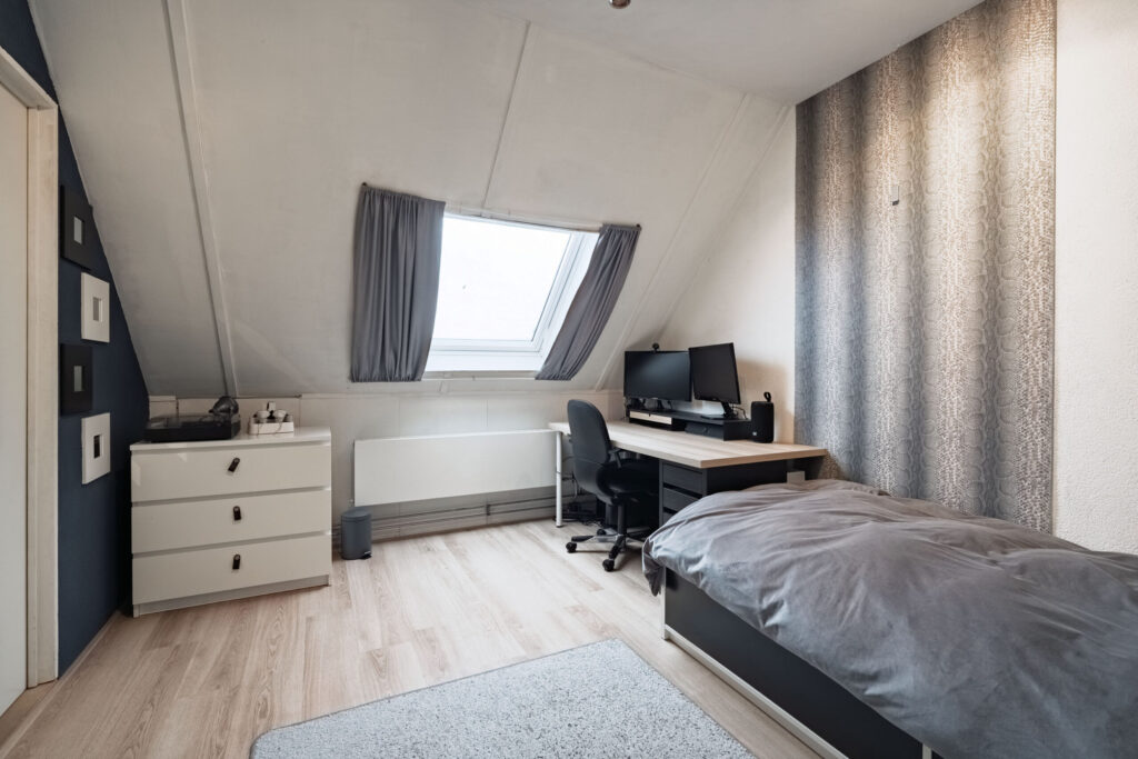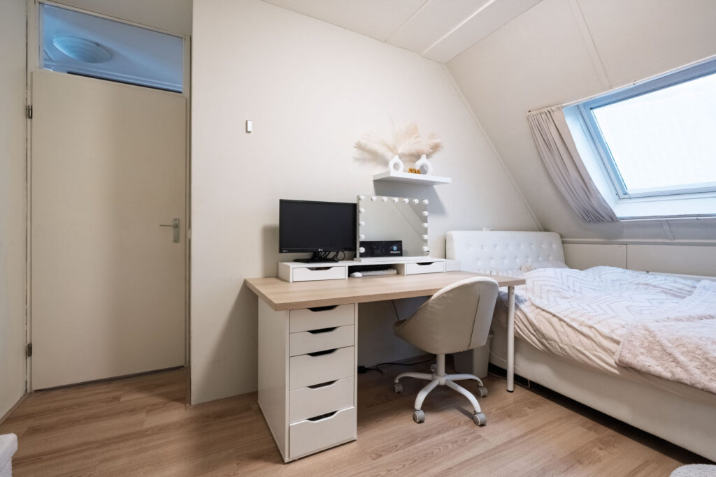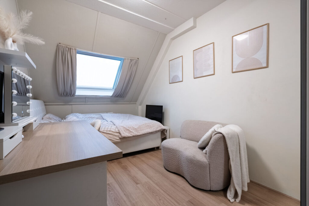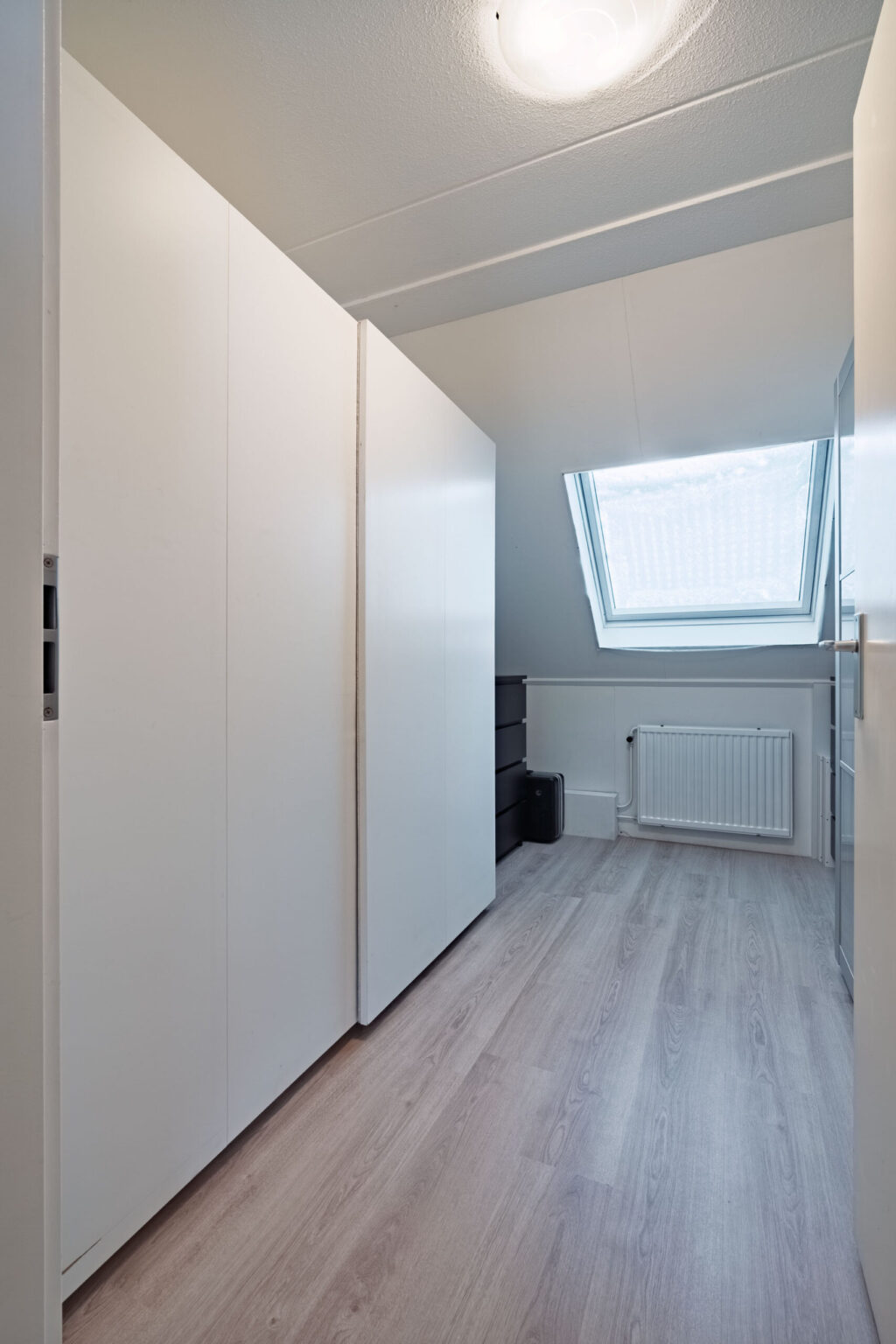 De overloop geeft toegang tot drie slaapkamers. Eén slaapkamer is gelegen aan de voorzijde van de woning. De overige twee slaapkamers bevinden zich aan de achterzijde en beschikken over extra bergruimte achter de knieschotten. Twee dakramen zorgen voor een prettige daglichtinval.