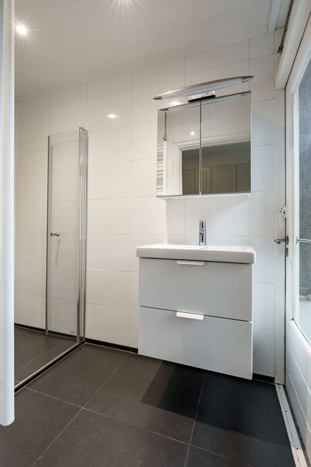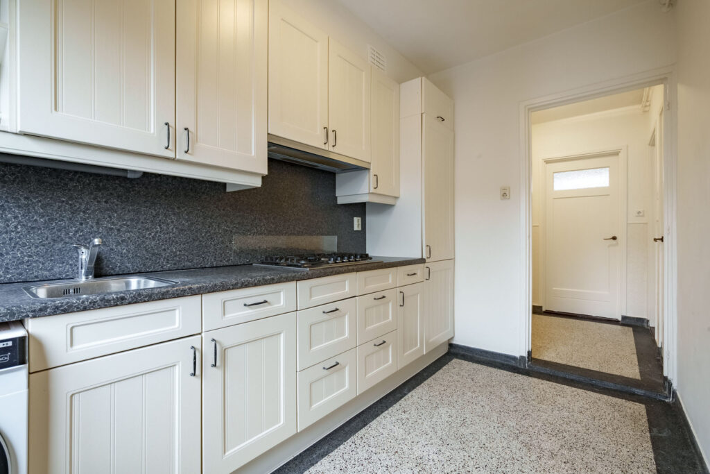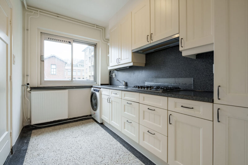 Gesloten keuken voorzien van een rechte opstelling en voorzien van diverse inbouwapparatuur, te weten: 5-pits gasfornuis, afzuigkap en koel-/vriescombinatie. Vanuit de keuken heb je toegang tot het balkon aan de achterzijde. In keuken is ook de aansluiting voor de wasmachine aanwezig. De badkamer is bereikbaar vanuit de keuken en voorzien van een douche, wastafelmeubel met spiegel.