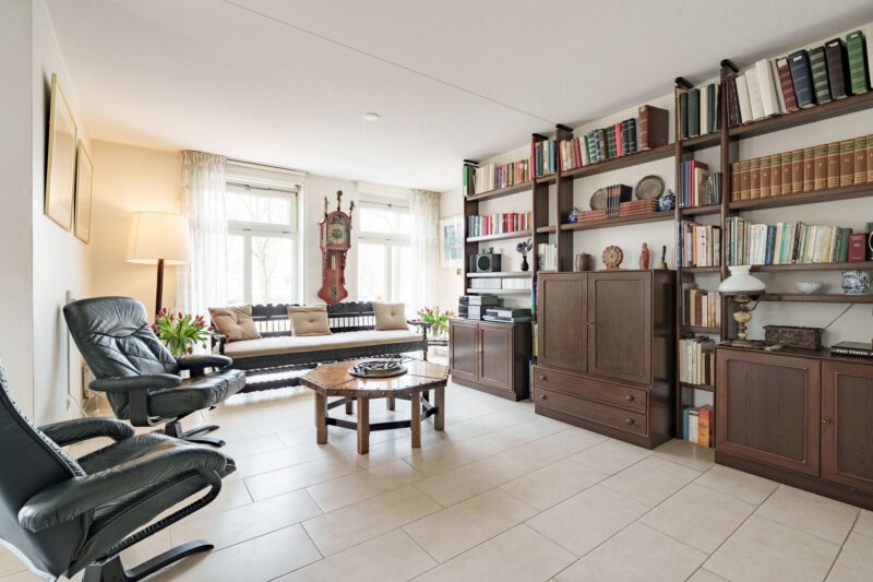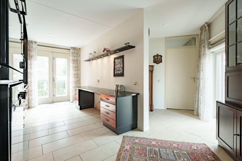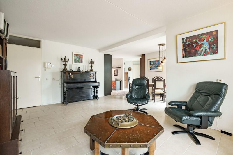 Wanneer we bij het appartement naar binnenstappen, komen we in een hal die ons direct toegang geeft tot verschillende ruimtes. De ruime woonkamer is een lichte en open ruimte dankzij de fijne raampartijen. De ramen bieden veel natuurlijk licht en een vrij uitzicht. De openslaande deuren geven toegang tot het ruime balkon.