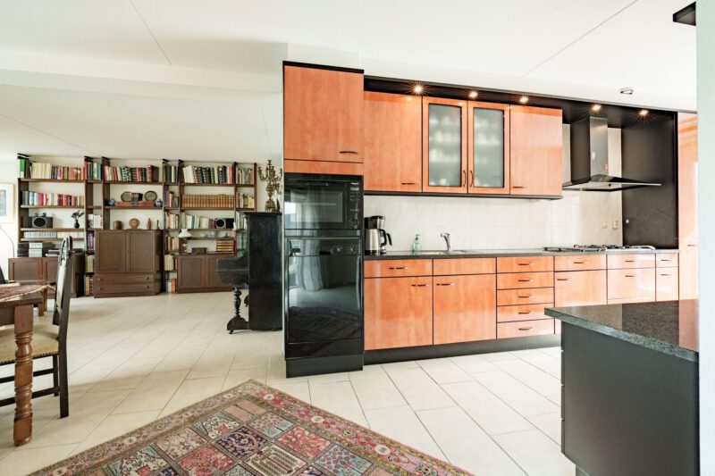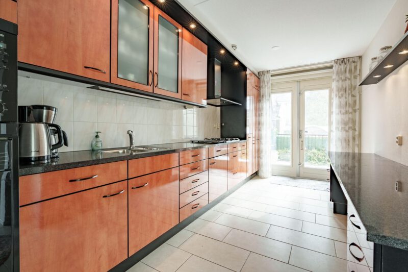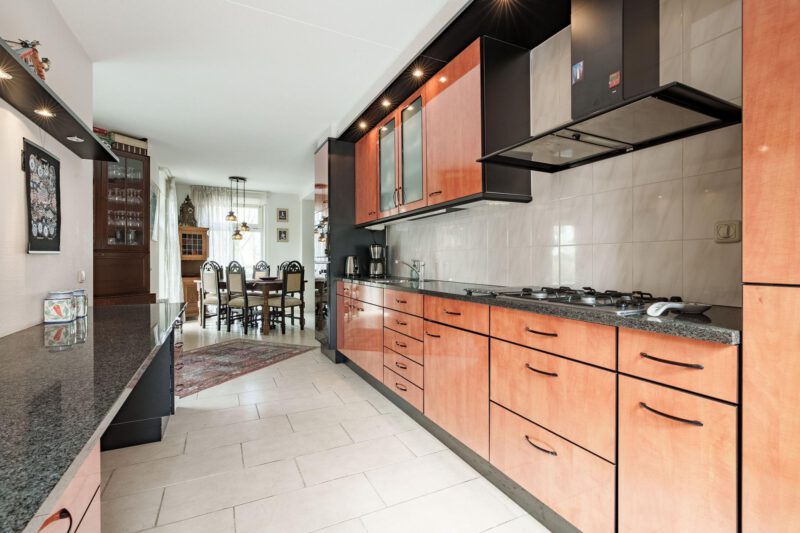 De open keuken grenst aan de woonkamer en is functioneel ingericht. De keuken beschikt over diverse inbouwapparatuur waaronder een 4-pit gasfornuis, afzuigkap, een combi magnetron, een vaatwasser en een koelkast. Er is ruimte voor het realiseren van een eethoek.