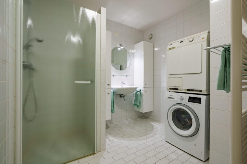 De badkamer is centraal gelegen en voorzien van een ruime douche, wastafelmeubel en aansluiting voor een wasmachine en droger. Daarnaast is er een separaat toilet.