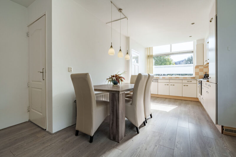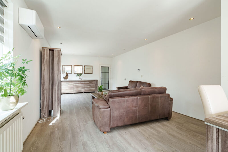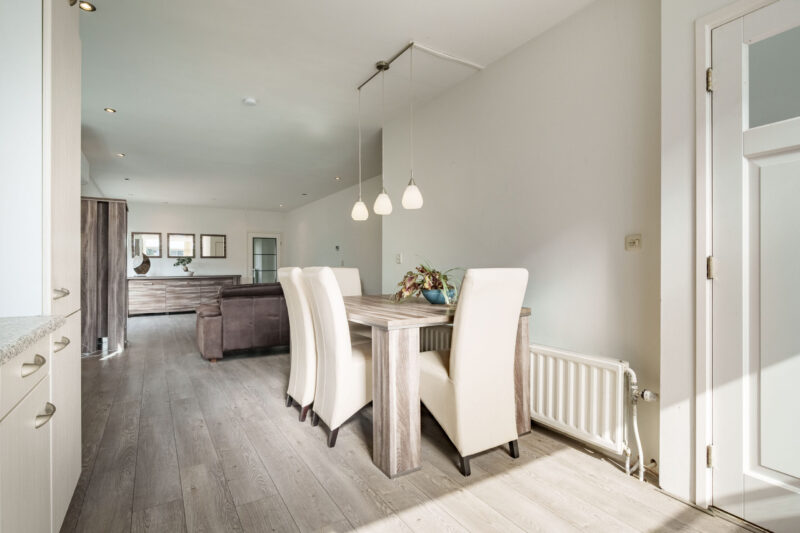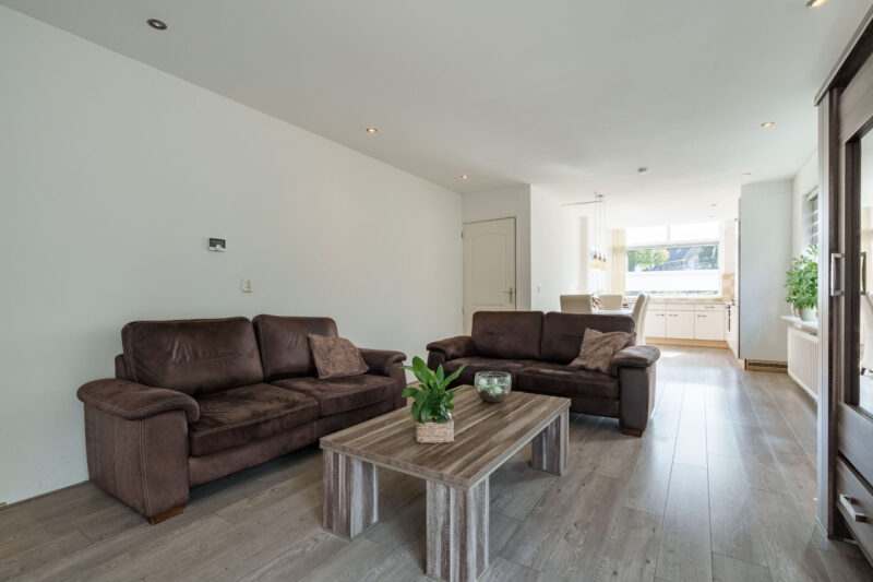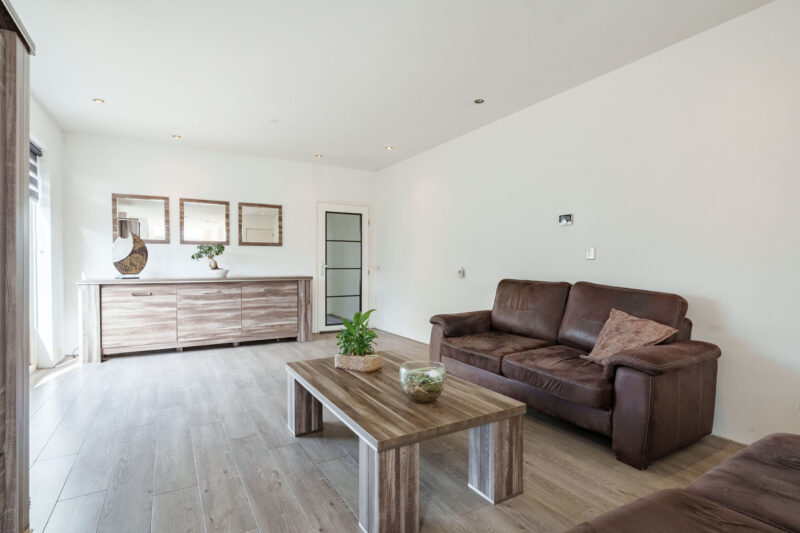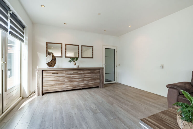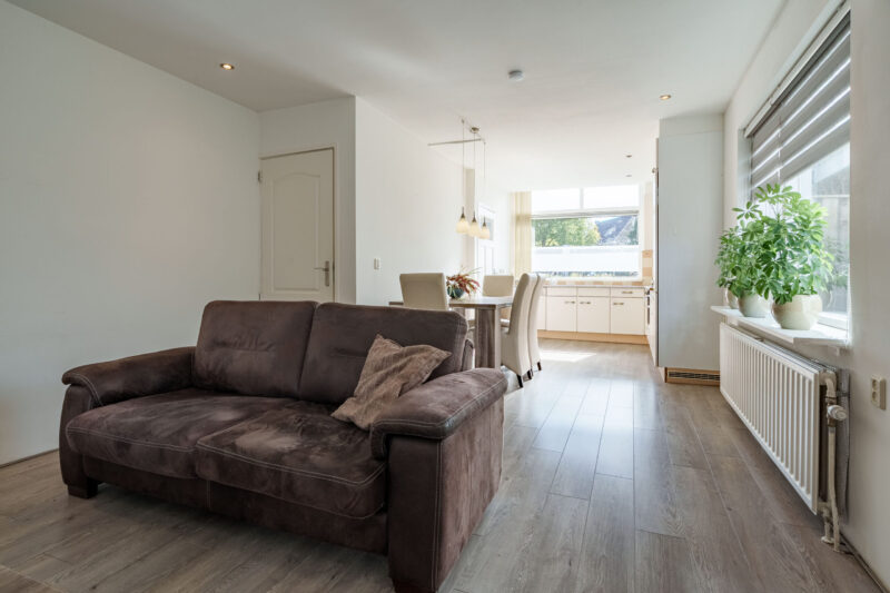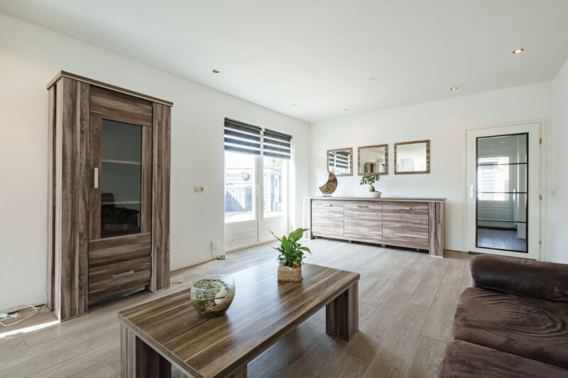 De langwerpige woonkamer biedt voldoende ruimte voor een comfortabele zit- en eethoek. Dankzij de openslaande deuren naar de tuin ervaart u een fijn binnen-buitengevoel. Door de combinatie van de grote raampartijen en de lichte wandafwerking oogt de woonkamer licht en ruimtelijk.