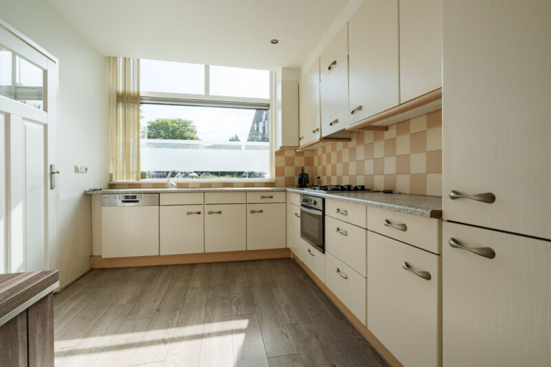 Via de entree bereikt u de hal met de trapopgang naar de eerste verdieping. Vanuit de woonkamer is een praktische opbergkast toegankelijk. De keuken is gesitueerd aan de voorzijde van de woning en uitgevoerd in een L-vormige opstelling, afgewerkt met een speelse blokjestegel. De keuken is voorzien van diverse inbouwapparatuur, waaronder een gasfornuis, afzuigkap, oven, koel-vriescombinatie en vaatwasser. De houten vloer in de keuken loopt door in de woonkamer.