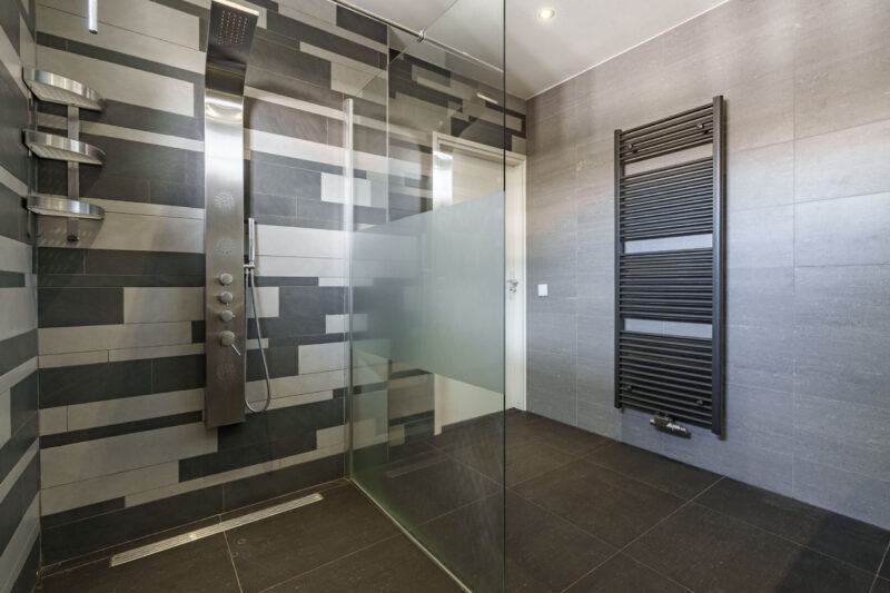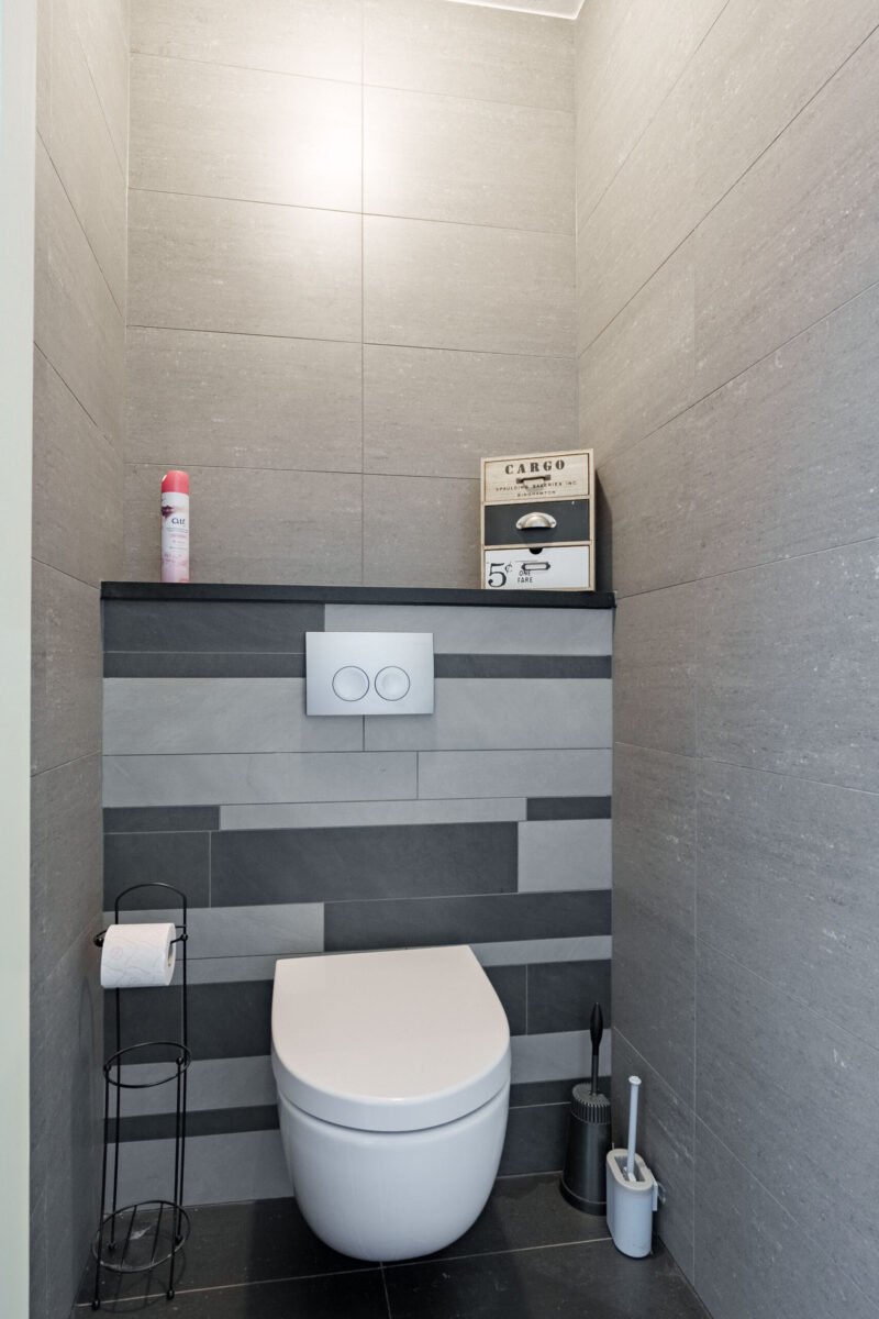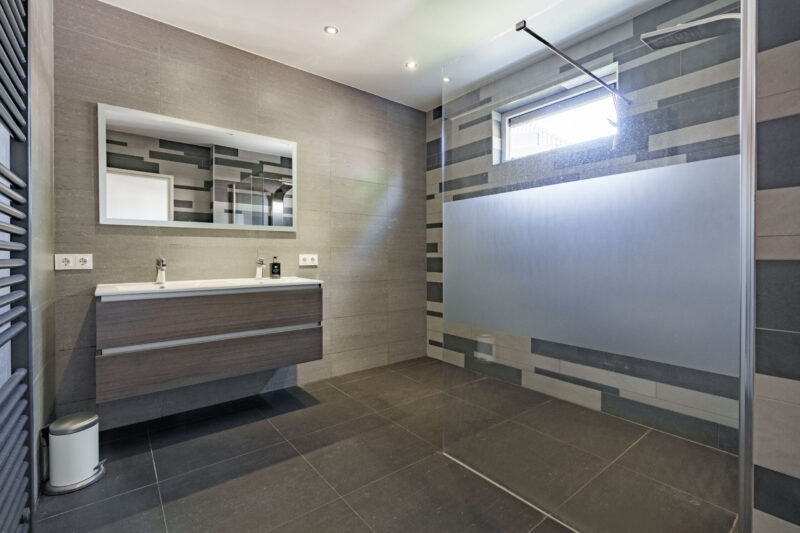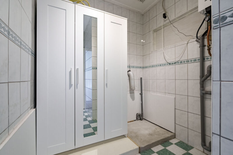 Aan de achterzijde van de woning bevinden zich de bijkeuken en de badkamer, beide gelegen op de begane grond. De betegelde bijkeuken beschikt over aansluitingen voor wasapparatuur. De badkamer is eveneens betegeld en uitgerust met een ruime inloopdouche, een verwarmd handdoekenrek en een dubbele wastafel met meubel. Dankzij het aanwezige raam is er bovendien voldoende daglicht en natuurlijke ventilatie. Er is een apart toilet aanwezig.