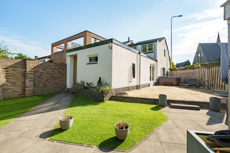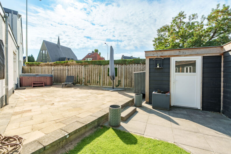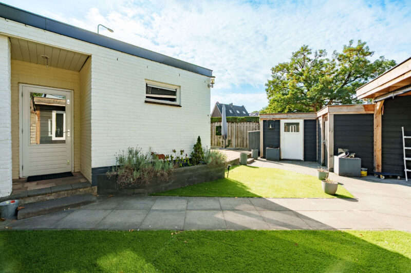 De ruime achtertuin, met achterom, is gesitueerd op het westen en is onderhoudsvriendelijk aangelegd met betegeling en kunstgras. De speelse hoogteverschillen geven de tuin een originele uitstraling. Achterin de tuin staat een houten veranda, een heerlijke plek om tot in de late uurtjes buiten te zitten. Daarnaast is er een houten berging, ideaal voor het opbergen van fietsen en gereedschap.