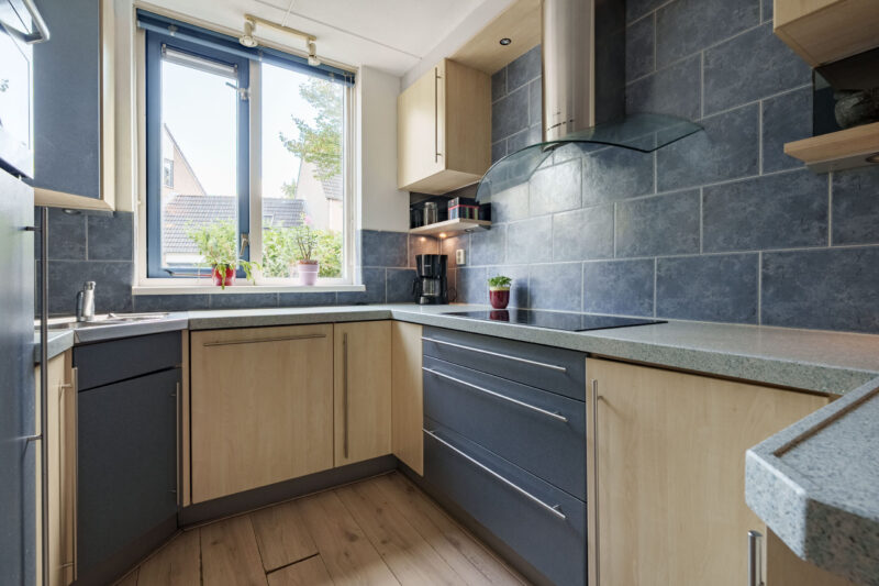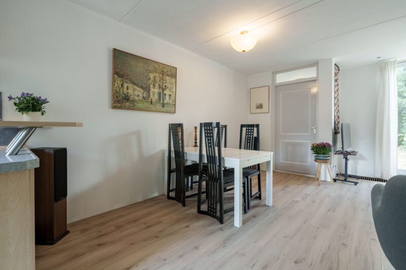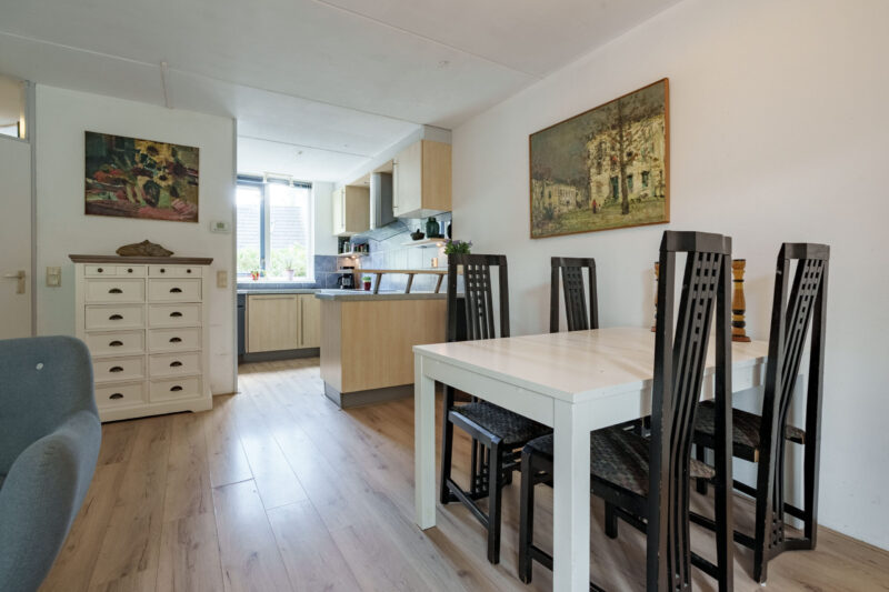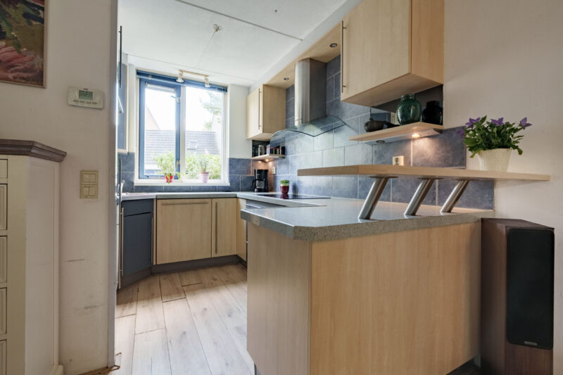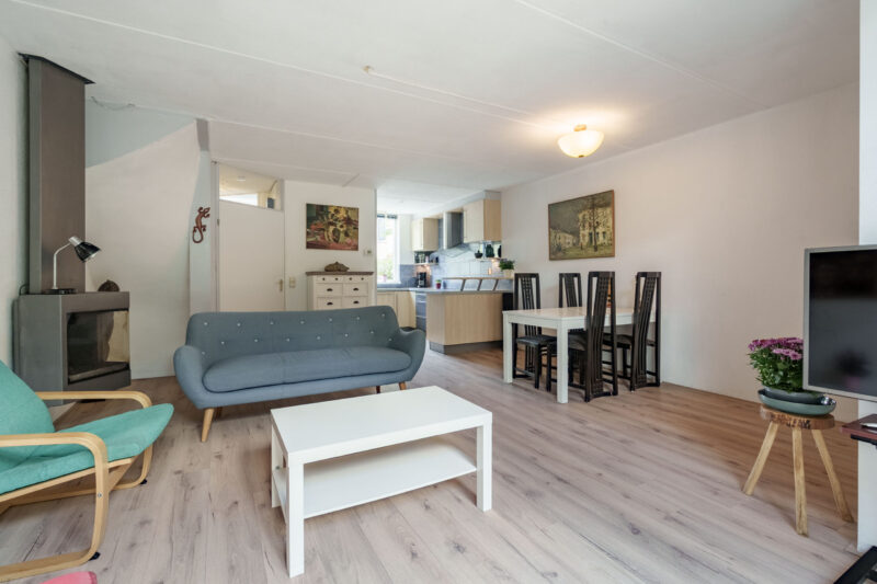 Wanneer u de woning binnenstapt, komt u in de hal waar zich het toilet met fonteintje, de meterkast en de trapopgang naar de eerste verdieping bevinden. Vanuit de hal loopt u door naar de uitgebouwde woonkamer, die dankzij de schuifpui een prettige verbinding met de tuin heeft. De gezellige houtkachel zorgt voor warmte en sfeer, waardoor de woonkamer ook tijdens de koude winteravonden een fijne plek is om samen te komen. Ook is er een bijkeuken aanwezig. De open keuken in U-opstelling en met bar is voorzien van diverse voorzieningen zoals: inductiekookplaat, afzuigkap, koelkast, oven en een vaatwasmachine.