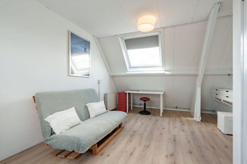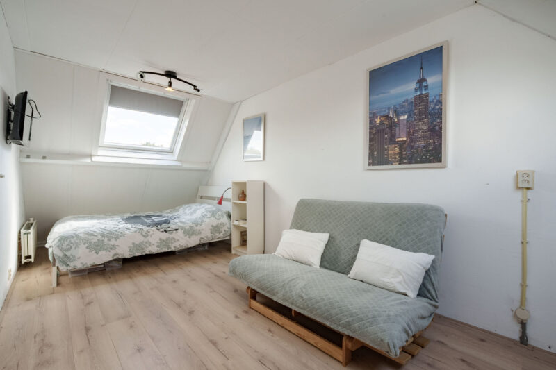 Overloop met de c.v.-combiketel, een royale zolderkamer met inloopkast. De zolderkamer heeft aan weerszijden een dakraam zodat er veel daglicht aanwezig is. Ook de inloopkast is voorzien van een dakraam.
