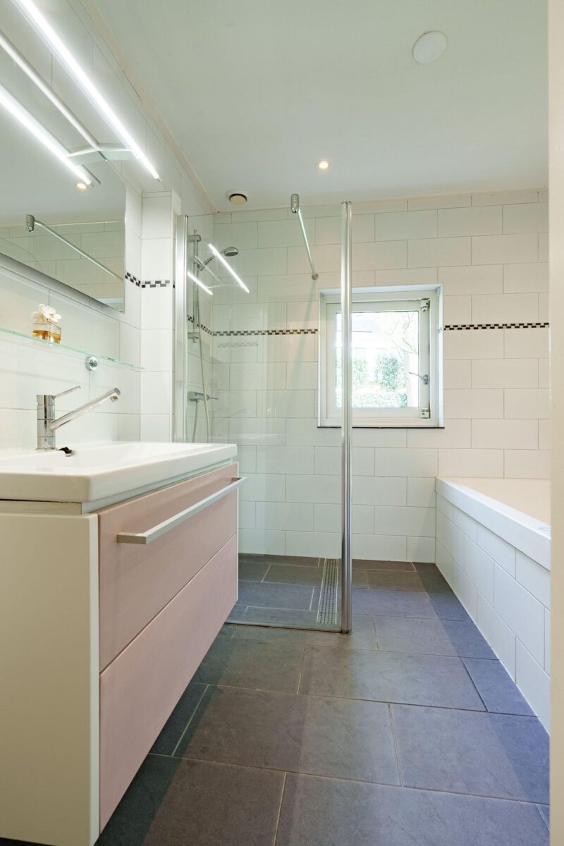 Verdieping: overloop, riante slaapkamer, een tweede badkamer voorzien van een douchecabine, toilet een twee wastafels Berging met de aansluiting voor de wasmachine. Op de verdieping is nog een ruime tweede slaapkamer aanwezig.