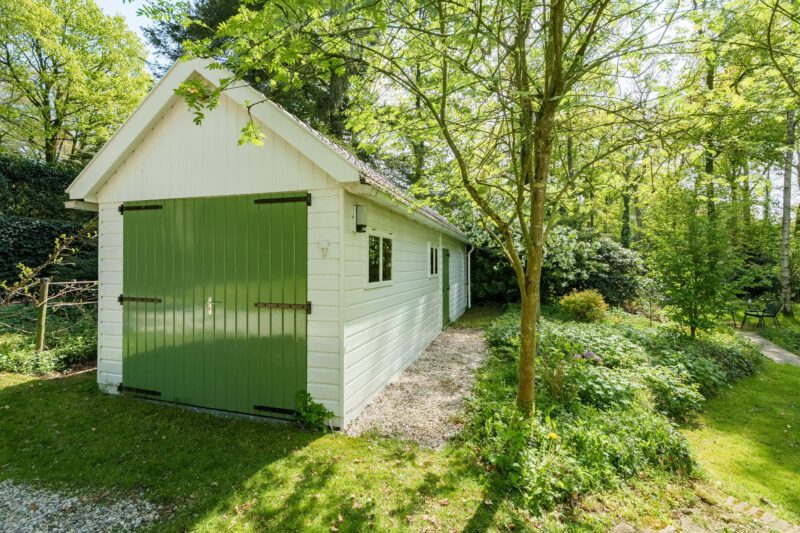 Op het terrein is een ruime houten garage / berging aanwezig met openslaande in hout uitgevoerde toegangsdeuren voor de auto en is verder eveneens voorzien van een separate loopdeur.