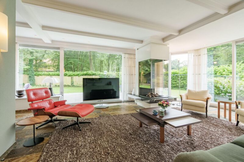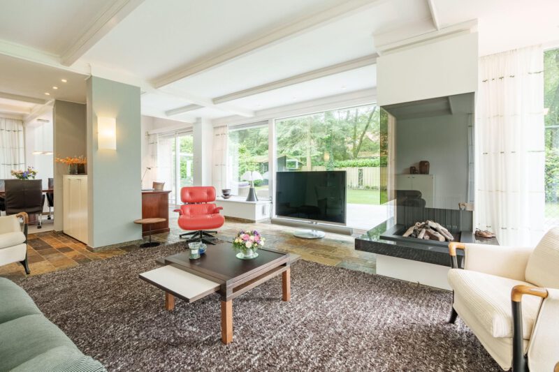 Begane grond: entree, garderobenis en toiletruimte voorzien vrijhangend toilet en fonteintje, een royale ontvangsthal voorzien van een open trap en vide. De van een grote raampartij voorziene ontvangsthal biedt toegang tot de slaapkamer op de begane grond, bijkeuken en de woonkamer. De lichte woonkamer van maar liefst ca. 67 m² heeft aan drie zijden mooi en ruim uitzicht op de tuin. De glazen gashaard en de erker zorgen voor een mooie sfeer en dit is dan ook een heerlijke plek om met het gezin te verblijven.