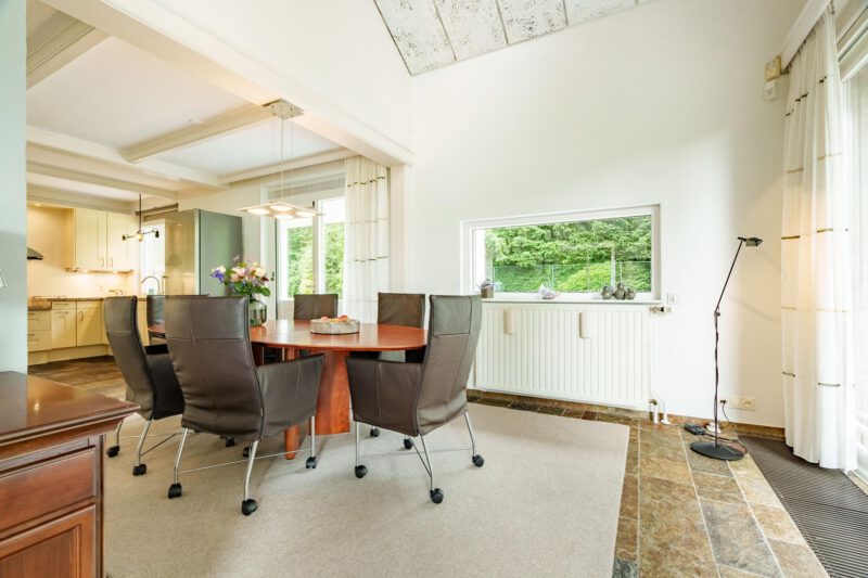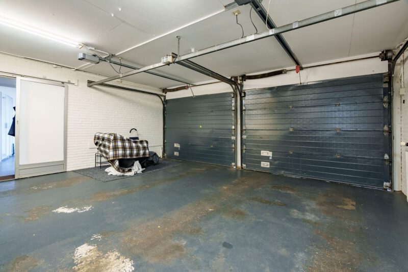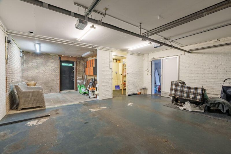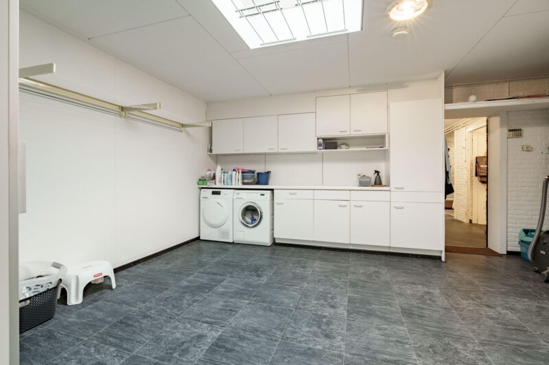 Aan het einde van de centrale hal bevindt zich de bijkeuken met diverse keuken- /werkkasten en aansluiting voor wasapparatuur. De bijkeuken biedt toegang tot de inpandig bereikbare garage van maar liefst circa 48 m². De verwarmde garage biedt mogelijkheid voor het stallen van twee auto’s en is voorzien van elektrische garagedeuren. Ook bevindt zich hier de technische ruimte met de Remeha C.V.-gas combiketel en een warmwatertapboiler.