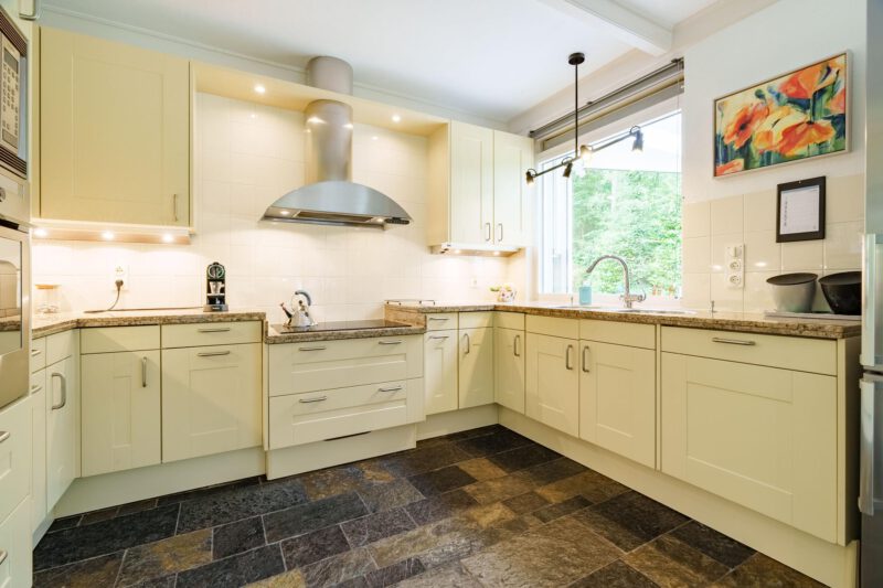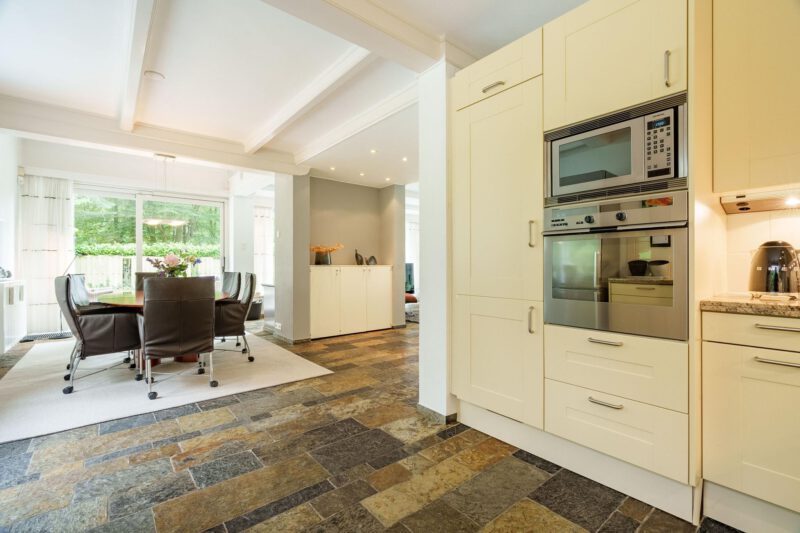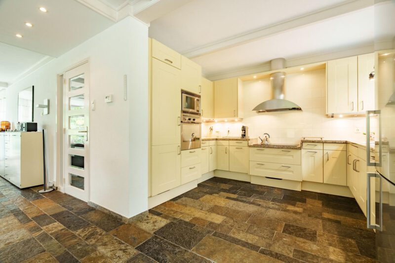 De keuken heeft een U-vormige Siematic keukenopstelling met een granieten aanrechtblad en diverse inbouwapparatuur, te weten: een heteluchtoven, magnetron, vaatwasser, RVS afzuigschouw en een inductiekookplaat.