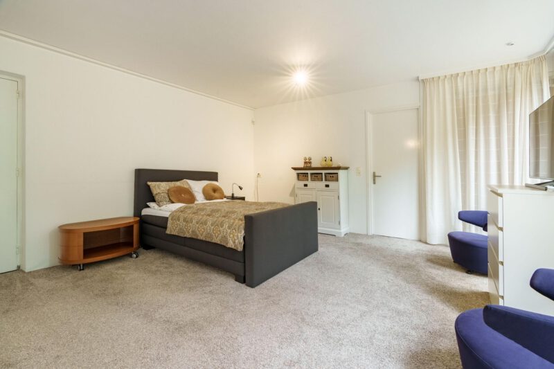 Vanuit de centrale hal is de grote slaapkamer van ca. 28 m² te bereiken voorzien van een badkamer en-suite. De slaapkamer heeft een grote schuifkastenwand, grote raampartijen tot op de grond en een loop- / tuindeur naar de tuin en het overdekte terras gesitueerd op de Oostzijde.