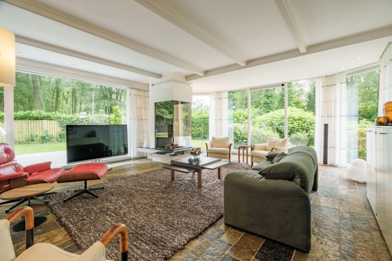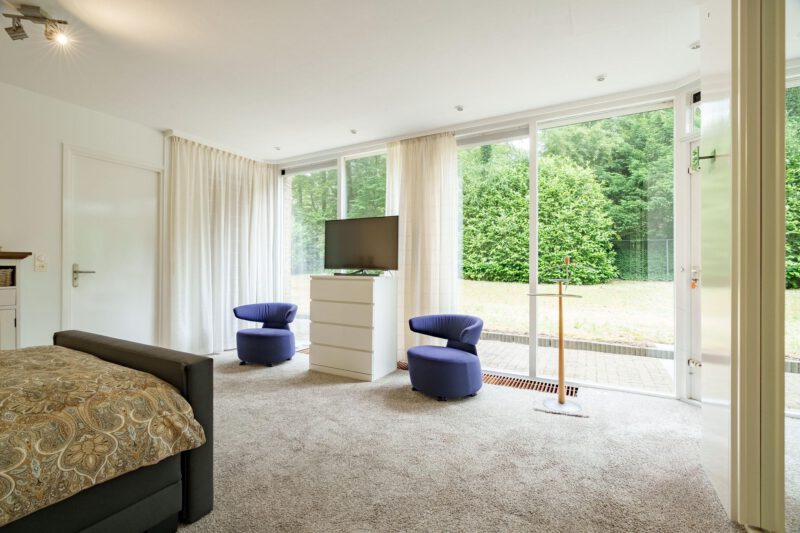De woning is helemaal omringt door een verzorgde zonnige tuin en heeft tevens een overdekt terras. Niet alleen de ruime woonkamer van maar liefst 67 m² maar ook de slaapkamer is voorzien van mooie grote raampartijen. Dit zorgt niet alleen voor veel lichtinval maar biedt ook een fijn uitzicht op de tuin.