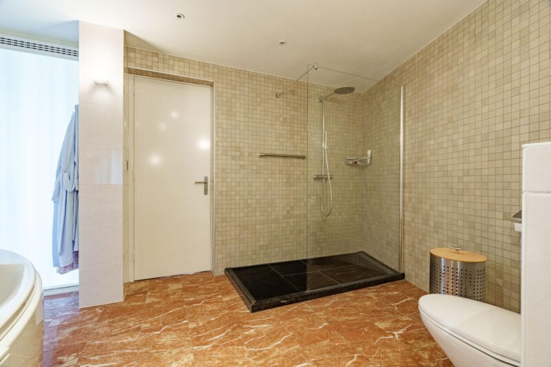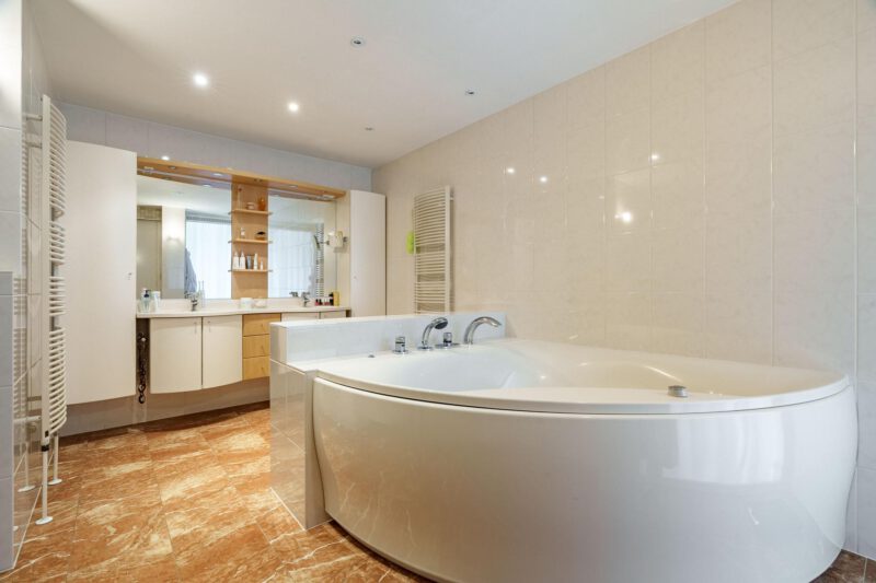 De badkamer en-suite is ruim van opzet en heeft een complete inrichting en is voorzien van een Whirlpool ligbad, inloopdouche, dubbel wastafelmeubel en een vrijhangend toilet.