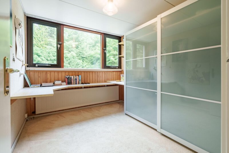 De woning heeft een riante slaapkamer op de begane grond met een complete badkamer en-suite. Op de verdieping bevinden zich nog twee ruime slaapkamers, een kleinere slaapkamer, een tweede badkamer en een vide die dienst heeft gedaan als werkkamer. Deze royale woning ligt op een heerlijke bosrijke en rustige locatie.