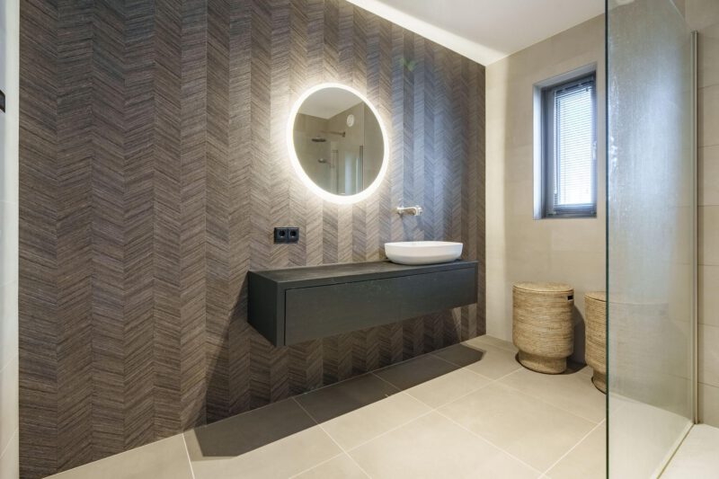 De badkamer heeft een stijlvolle en luxe inrichting.
