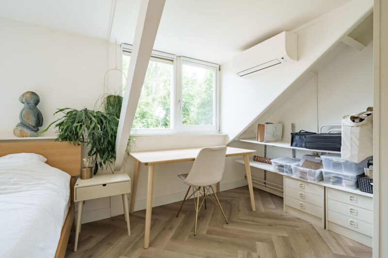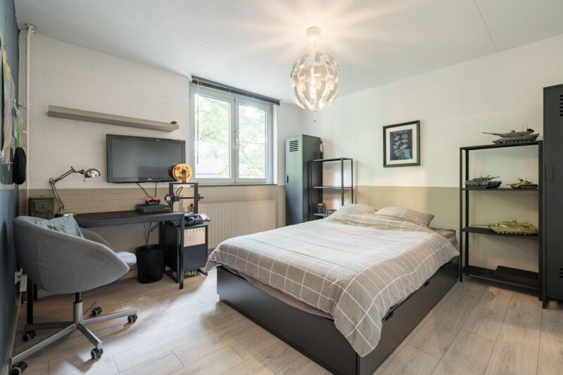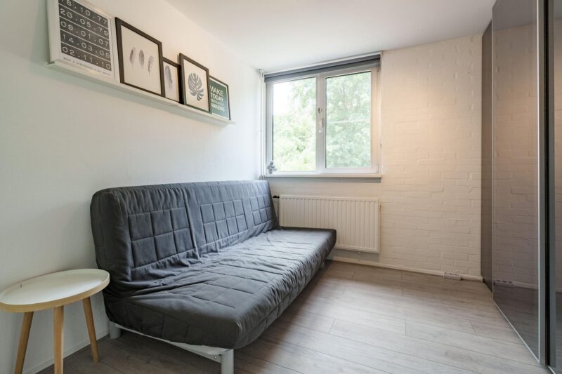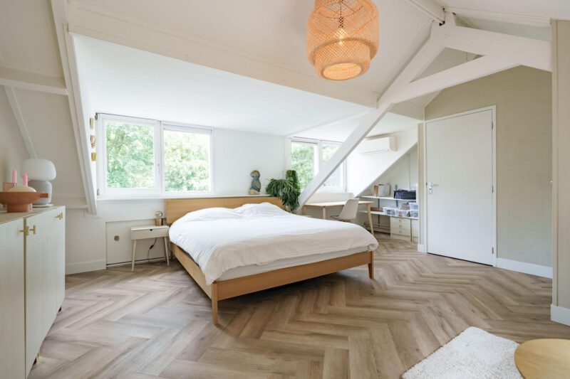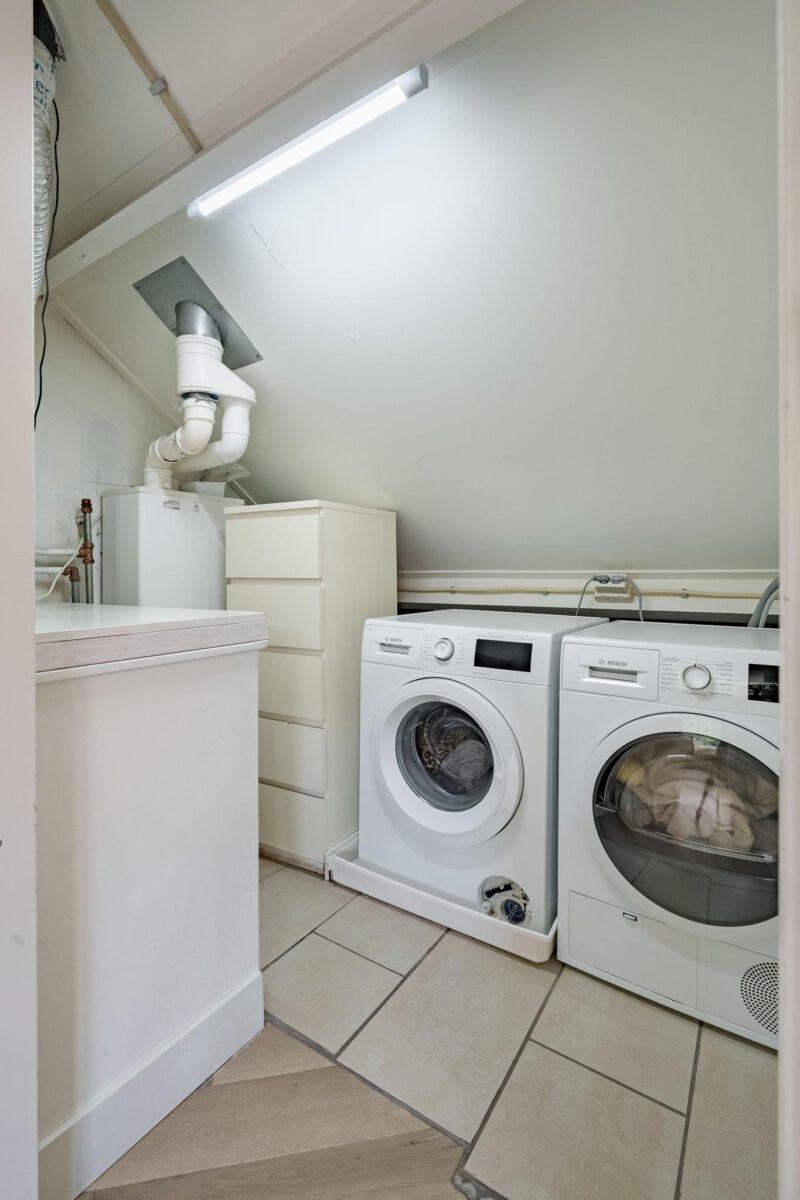 De tweede verdieping is verrassend ruim en biedt volop mogelijkheden. Hier bevindt zich een royale slaapkamer, voorzien van een vrijstaand ligbad – een luxe toevoeging die zorgt voor een ontspannen sfeer. De ruimte is dankzij de afmetingen flexibel in te richten. Daarnaast is er een aparte wasruimte aanwezig, met aansluitingen voor zowel wasmachine als droger. Achter de knieschotten bevinden zich praktische bergingen, ideaal voor het opbergen van seizoensspullen of andere benodigdheden.