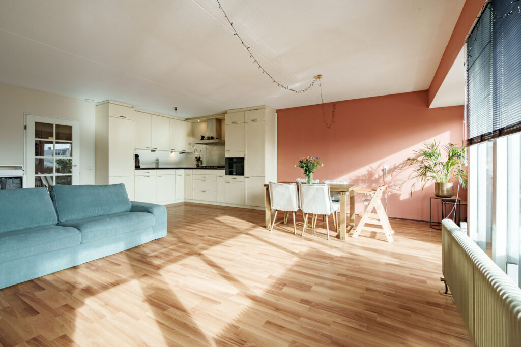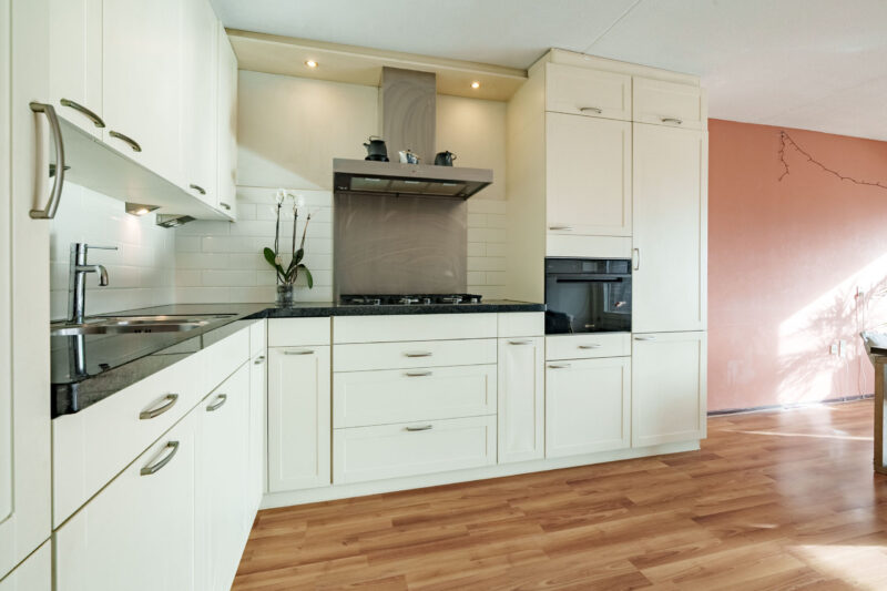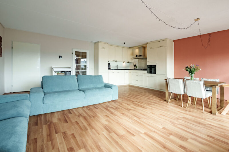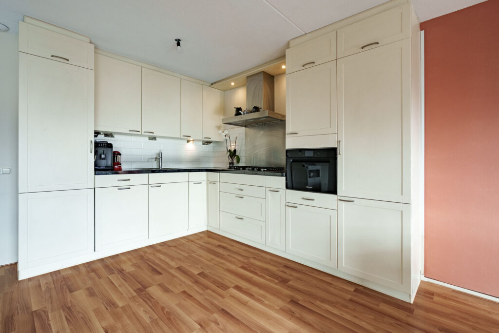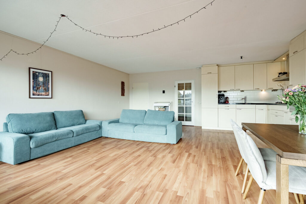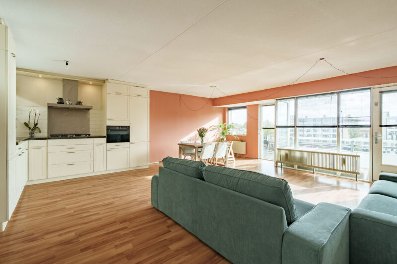 De royale en lichte woonkamer beschikt over een vaste kast en een deur naar het ruime balkon op het zuiden, waar u heerlijk van de zon kunt genieten. De open keuken is opgesteld in een praktische L-vorm en uitgerust met diverse inbouwapparatuur, waaronder een koelkast, vaatwasser, combi-oven, 5-pits gaskookplaat en afzuigkap.