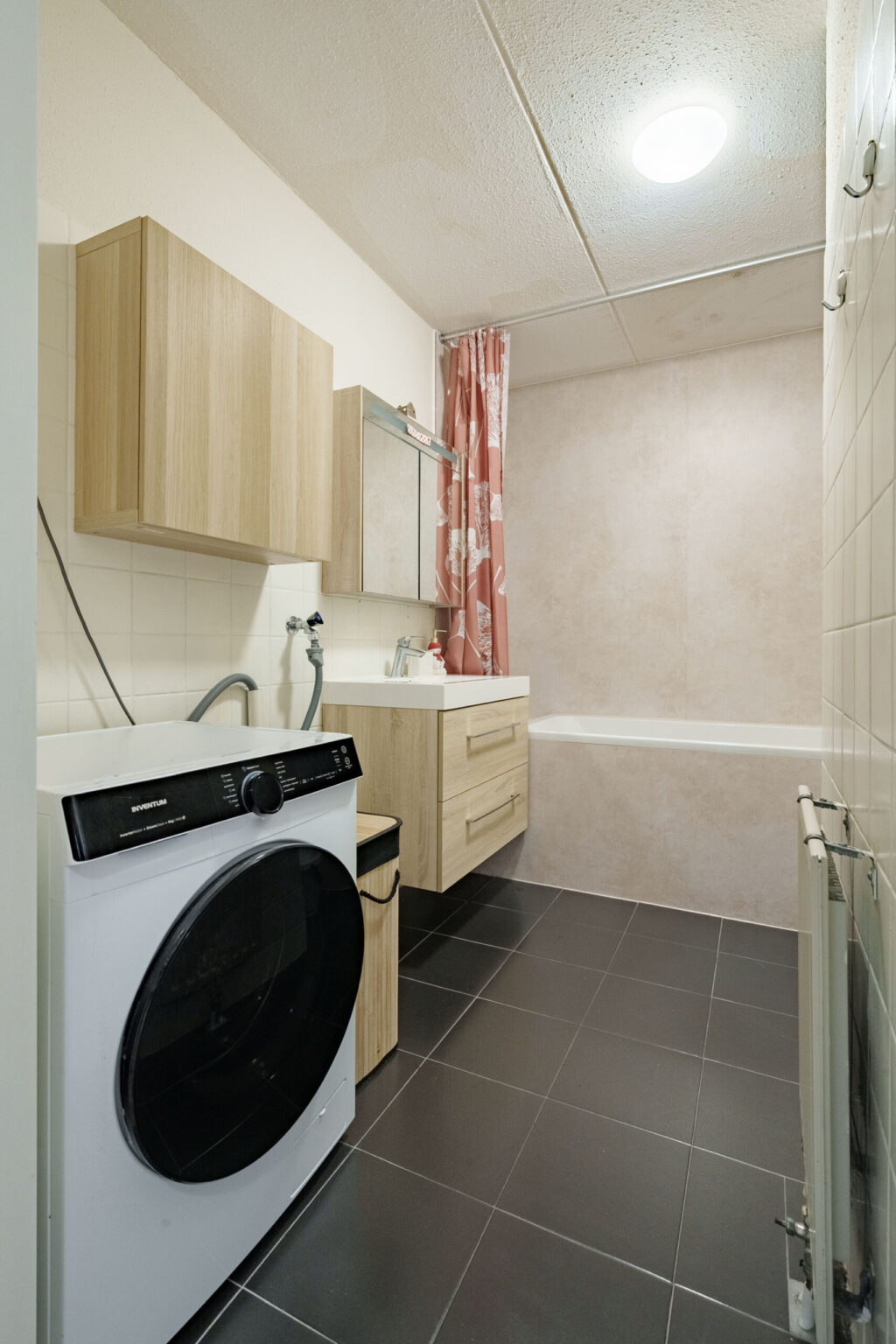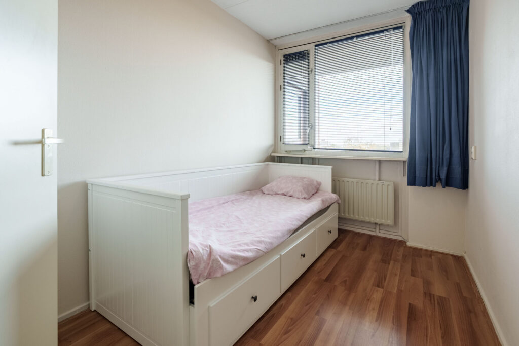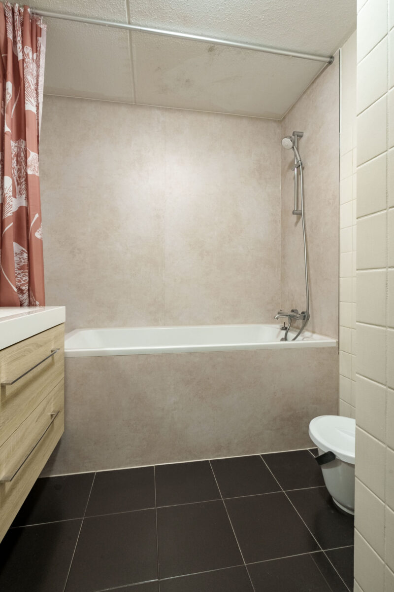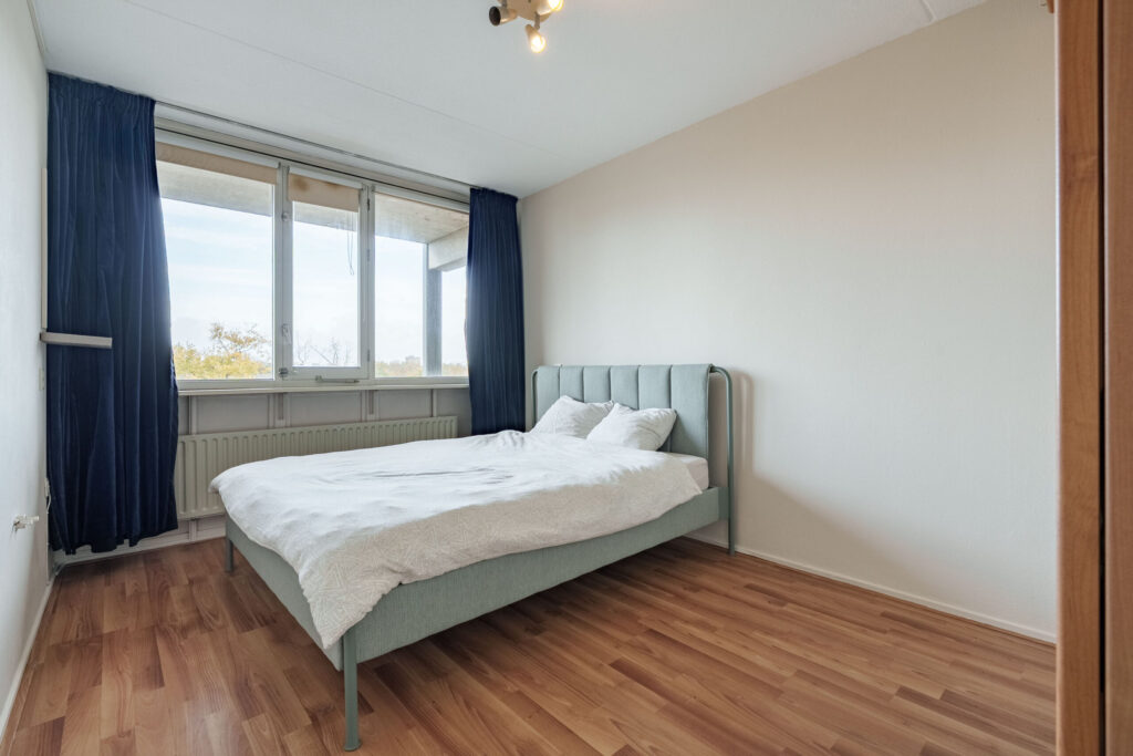 Aan de achterzijde van het appartement bevinden zich twee slaapkamers, beide met een prettige lichtinval en een praktische indeling. De badkamer is uitgevoerd in een lichte kleurstelling en voorzien van een bad/douchecombinatie, wastafel met meubel en aansluitingen voor wasapparatuur.